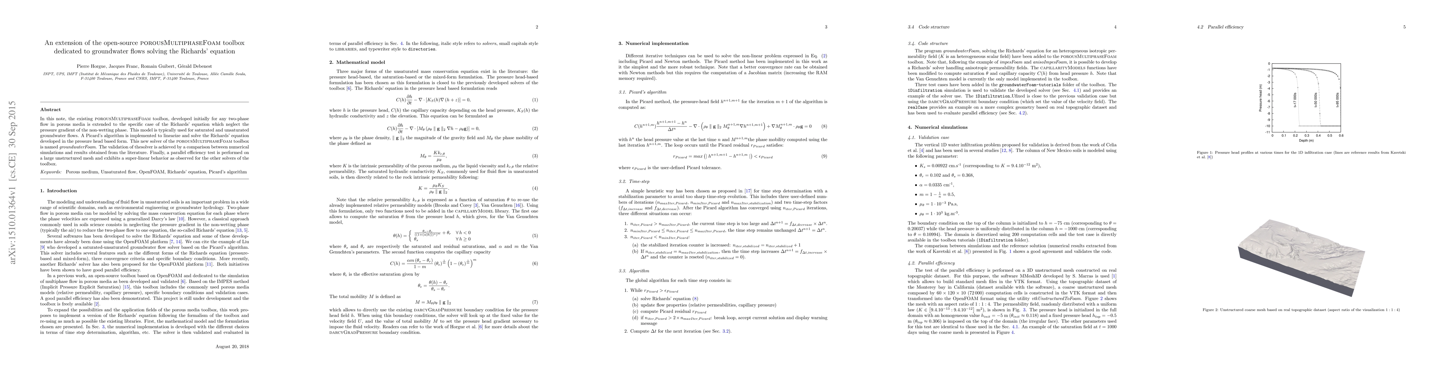 This paper extends the porousMultiphaseFoam toolbox to solve Richards' equation for groundwater flows, implementing a Picard's algorithm for linearization. The new solver, groundwaterFoam, is validated against literature results and shows super-linear parallel efficiency on large meshes.