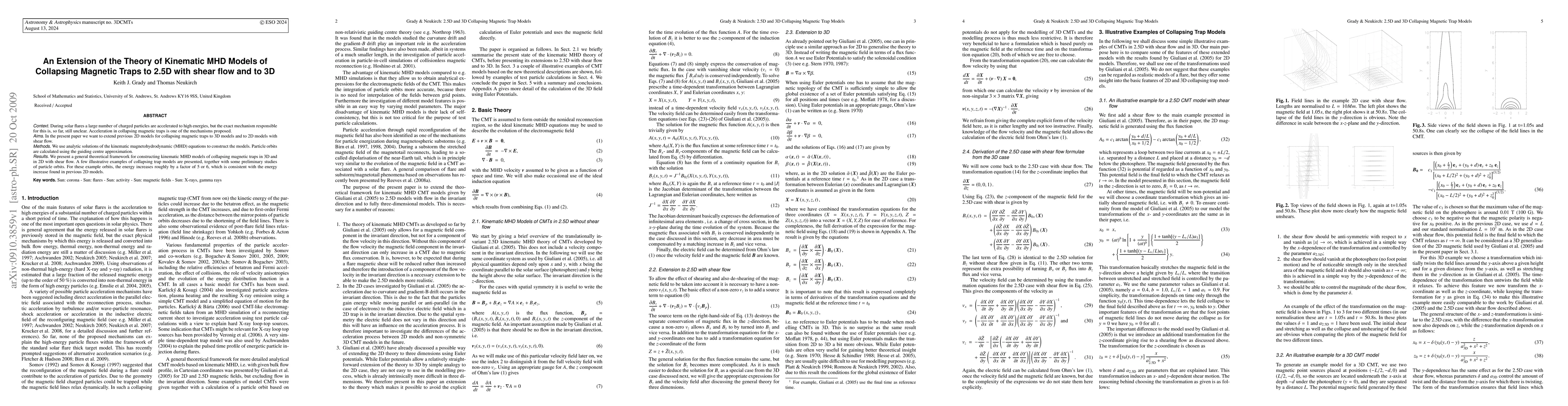This paper extends 2D kinematic MHD models of collapsing magnetic traps to 3D and introduces 2D models with shear flow, providing a theoretical framework for both. The study shows that particle energy increases by a factor of 5-6, consistent with previous 2D findings.