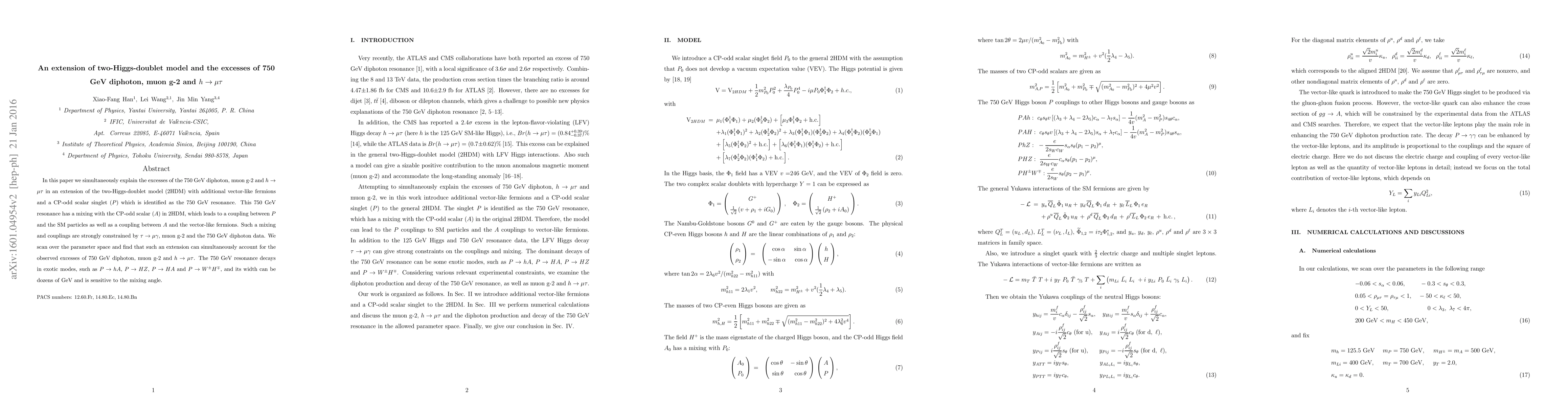 This paper proposes an extended two-Higgs-doublet model with vector-like fermions and a CP-odd scalar to explain the observed excesses in 750 GeV diphoton, muon g-2, and $h\to\mu\tau$ decays. The model includes a 750 GeV resonance that mixes with the CP-odd scalar, leading to significant couplings and decay modes that account for these excesses.