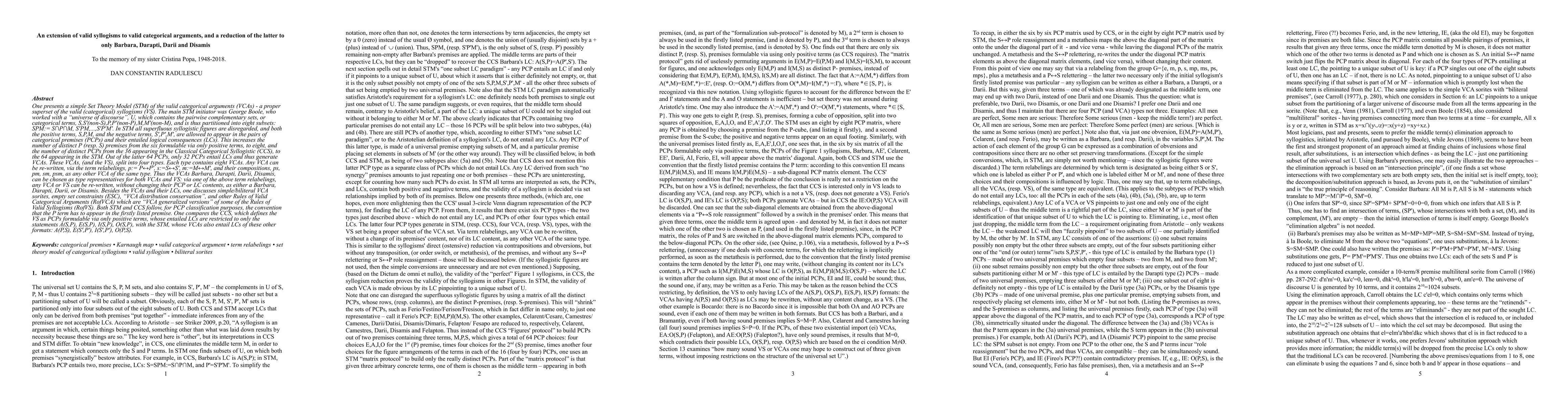 This paper extends valid categorical syllogisms to valid categorical arguments using a Set Theory Model (STM), reducing all valid arguments to four types represented by Barbara, Darapti, Darii, and Disamis, while discussing rules and constraints for these arguments.