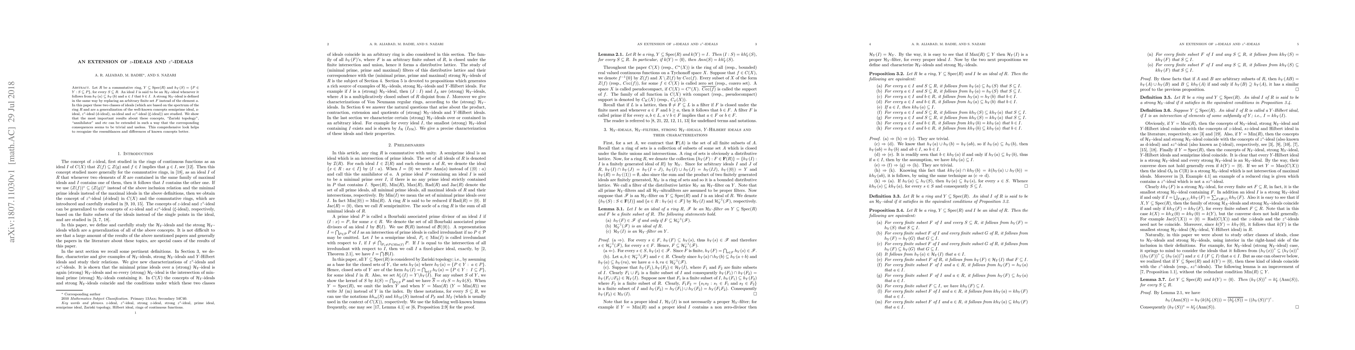 Let $R$ be a commutative ring, $Y\subseteq \mathrm{Spec}(R)$ and $ h_Y(S)=\{P\in Y:S\subseteq P \}$, for every $S\subseteq R$. An ideal $I$ is said to be an $\mathcal{H}_Y$-ideal whenever it follows from $h_Y(a)\subseteq h_Y(b)$ and $a\in I$ that $b\in I$. A strong $\mathcal{H}_Y$-ideal is defined in the same way by replacing an arbitrary finite set $F$ instead of the element $a$. In this paper these two classes of ideals (which are based on the spectrum of the ring $R$ and are a generalization of the well-known concepts semiprime ideal, z-ideal, $z^{\circ}$-ideal (d-ideal), sz-ideal and $sz^{\circ}$-ideal ($\xi$-ideal)) are studied. We show that the most important results about these concepts, "Zariski topology", "annihilator" and etc can be extended in such a way that the corresponding consequences seems to be trivial and useless. This comprehensive look helps to recognize the resemblances and differences of known concepts better.