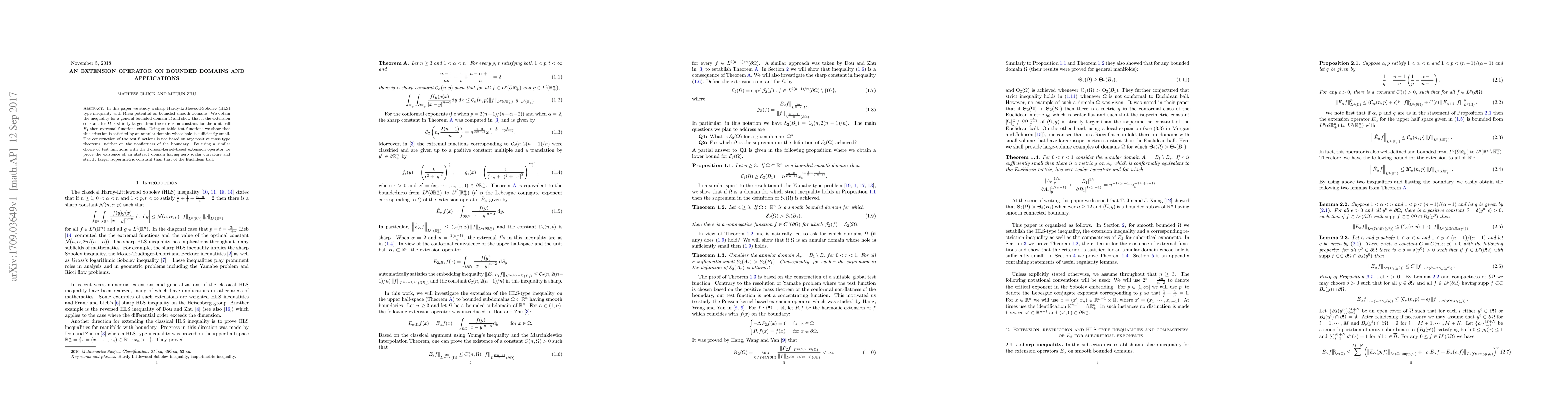 In this paper we study a sharp Hardy-Littlewood-Sobolev (HLS) type inequality with Riesz potential on bounded smooth domains. We obtain the inequality for a general bounded domain $\Omega$ and show that if the extension constant for $\Omega$ is strictly larger than the extension constant for the unit ball $B_1$ then extremal functions exist. Using suitable test functions we show that this criterion is satisfied by an annular domain whose hole is sufficiently small. The construction of the test functions is not based on any positive mass type theorems, neither on the nonflatness of the boundary. By using a similar choice of test functions with the Poisson-kernel-based extension operator we prove the existence of an abstract domain having zero scalar curvature and strictly larger isoperimetric constant than that of the Euclidean ball.