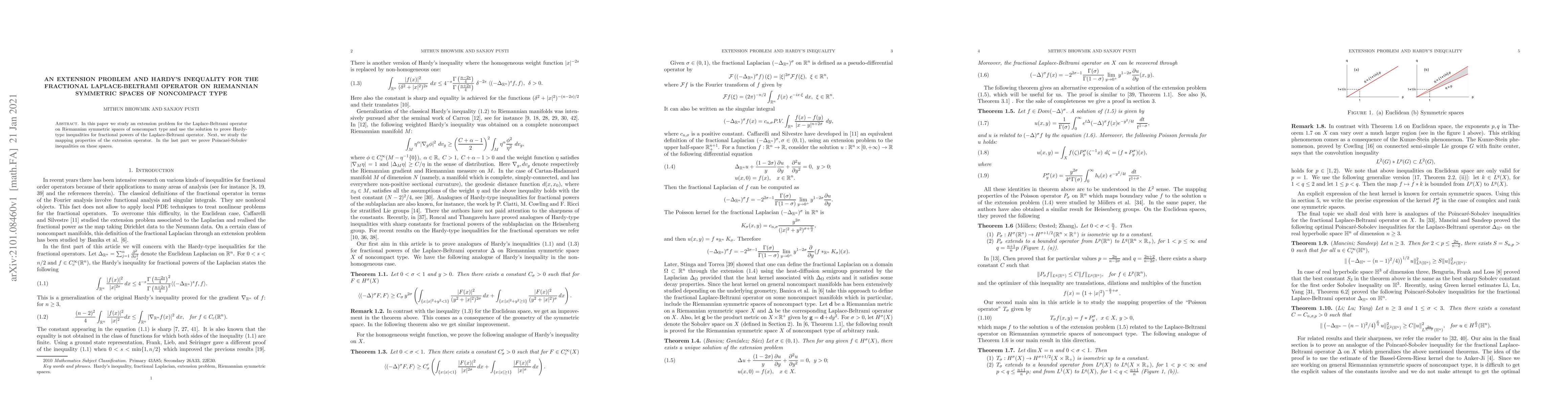 This paper investigates an extension problem for the Laplace-Beltrami operator on Riemannian symmetric spaces of noncompact type, utilizing the solution to establish Hardy-type inequalities for fractional powers of the operator. It also explores the mapping properties of the extension operator and concludes with the proof of Poincaré-Sobolev inequalities on these spaces.
