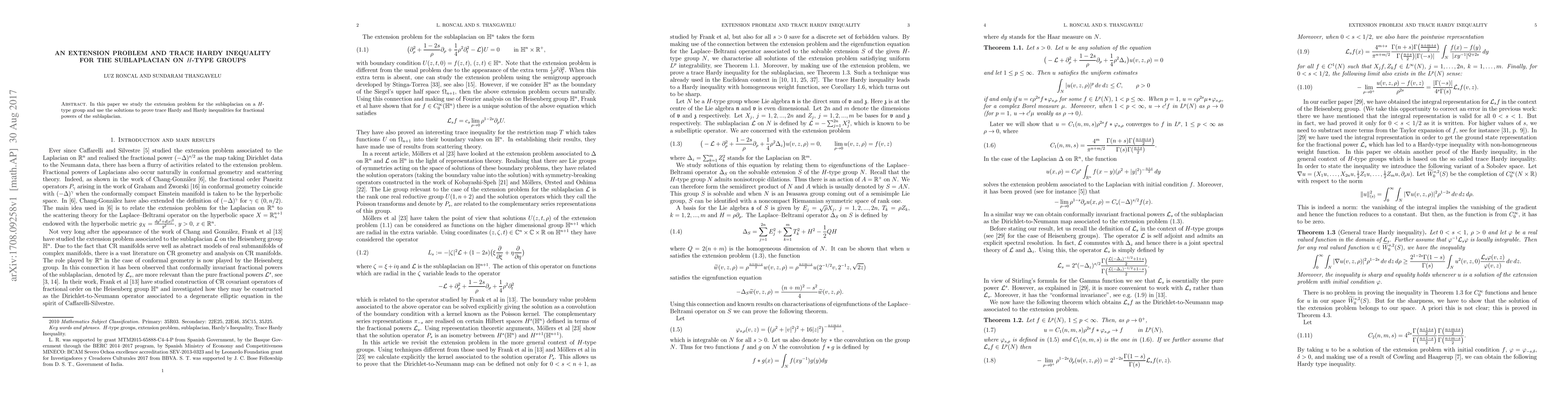 This paper investigates the extension problem for the sublaplacian on H-type groups and establishes trace Hardy and Hardy inequalities for fractional powers of the sublaplacian.