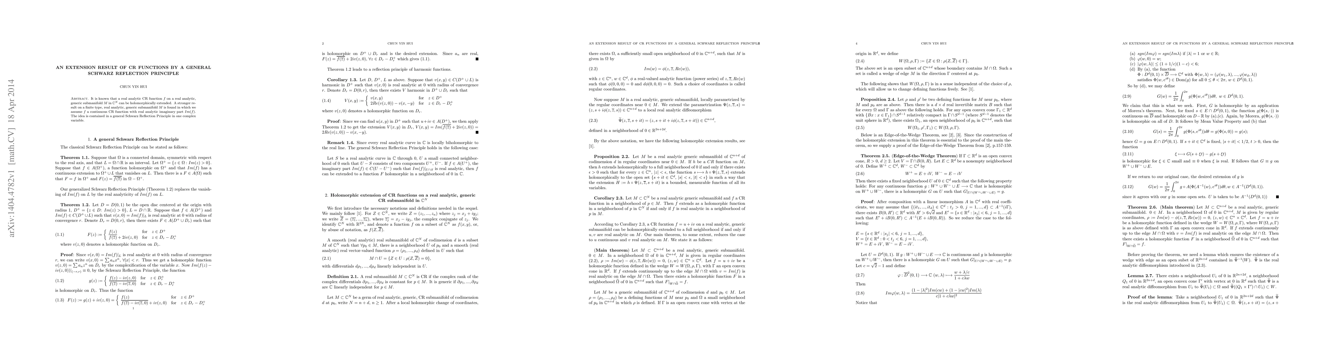 It is known that a real analytic CR function f on a real analytic, generic submanifold M in C^N can be holomorphically extended. A stronger result on a finite type, real analytic, generic submanifold M is found in which we assume f a continuous CR function with real analytic imaginary part Im(f). The idea is contained in a general Schwarz Reflection Principle in one complex variable.