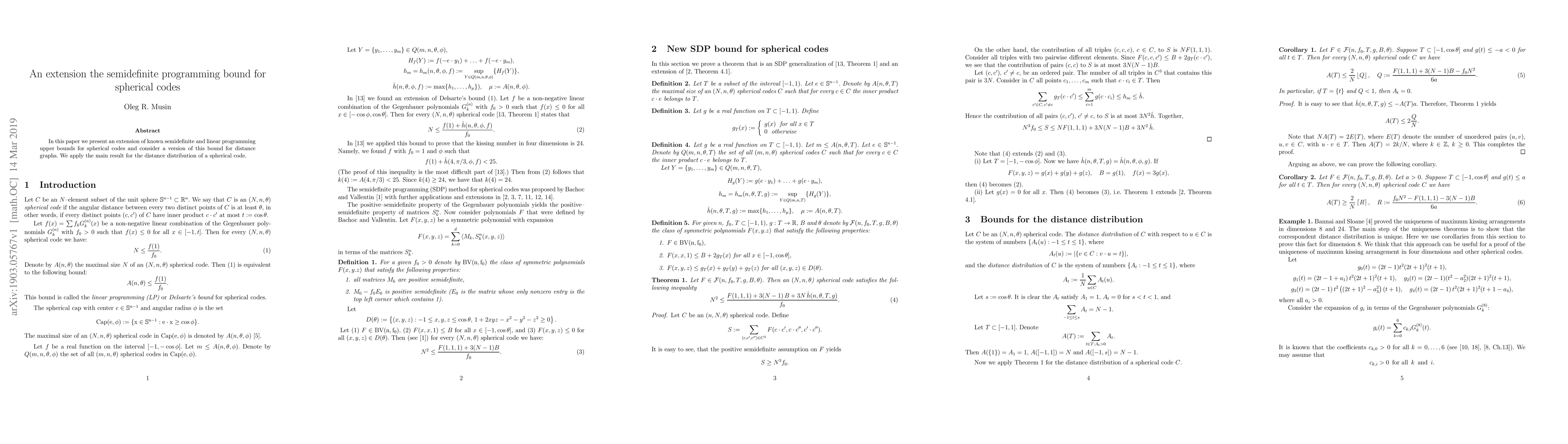 In this paper we present an extension of known semidefinite and linear programming upper bounds for spherical codes and consider a version of this bound for distance graphs. We apply the main result for the distance distribution of a spherical code.
