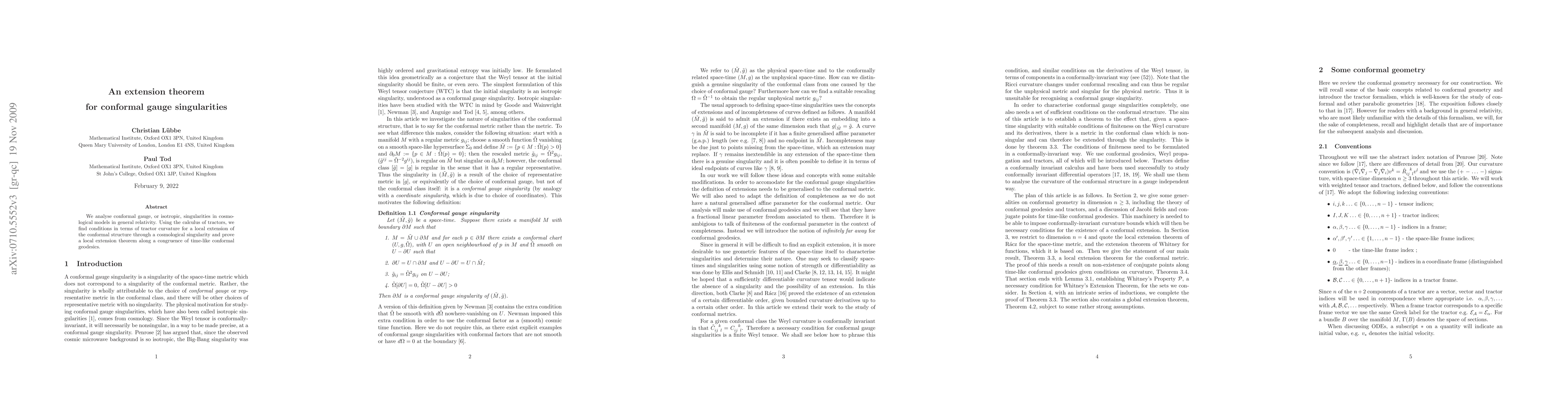 The paper investigates conformal gauge singularities in cosmological models within general relativity and, using the calculus of tractors, establishes conditions for extending the conformal structure across a cosmological singularity, proving a local extension theorem.