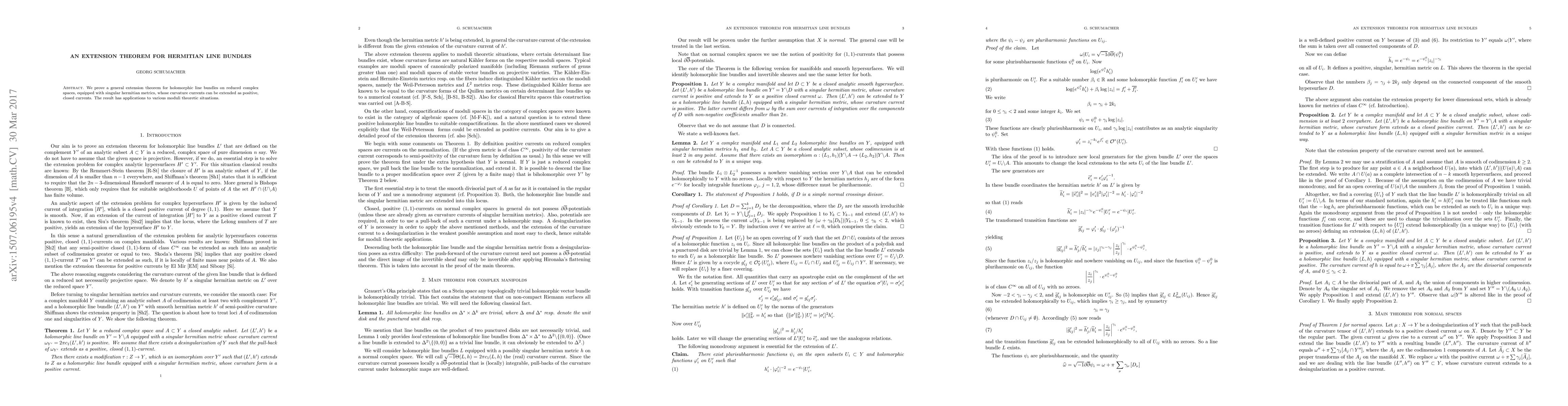 This paper proves an extension theorem for holomorphic line bundles on reduced complex spaces with singular hermitian metrics, where the curvature currents extend as positive, closed currents, with implications for moduli theory.