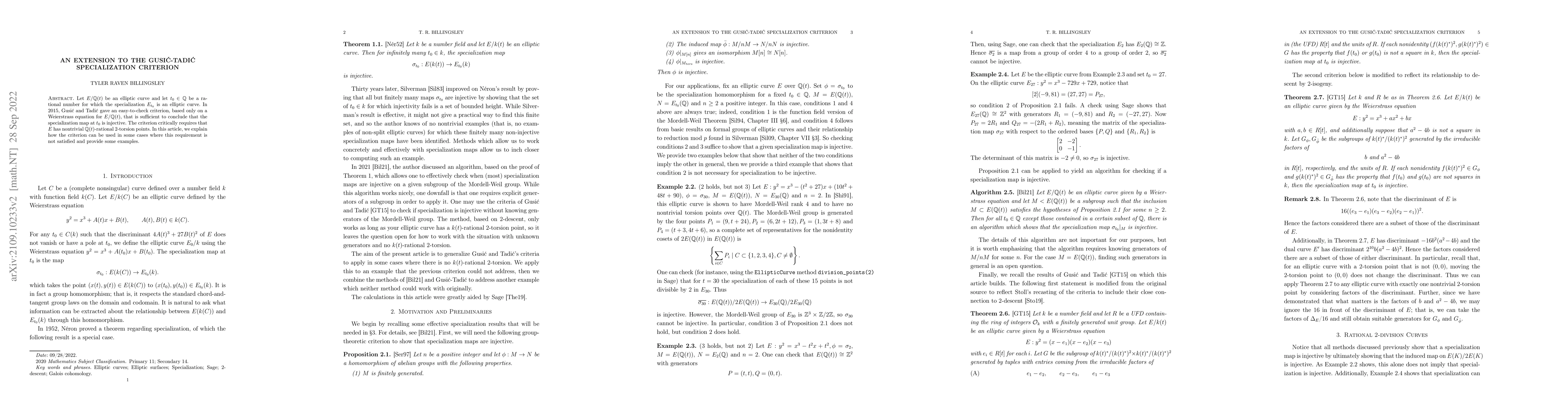 Let $E/\mathbb Q(t)$ be an elliptic curve and let $t_0 \in \mathbb Q$ be a rational number for which the specialization $E_{t_0}$ is an elliptic curve. In 2015, Gusi\'c and Tadi\'c gave an easy-to-check criterion, based only on a Weierstrass equation for $E/\mathbb Q(t)$, that is sufficient to conclude that the specialization map at $t_0$ is injective. The criterion critically requires that $E$ has nontrivial $\mathbb Q(t)$-rational 2-torsion points. In this article, we explain how the criterion can be used in some cases where this requirement is not satisfied and provide some examples.
