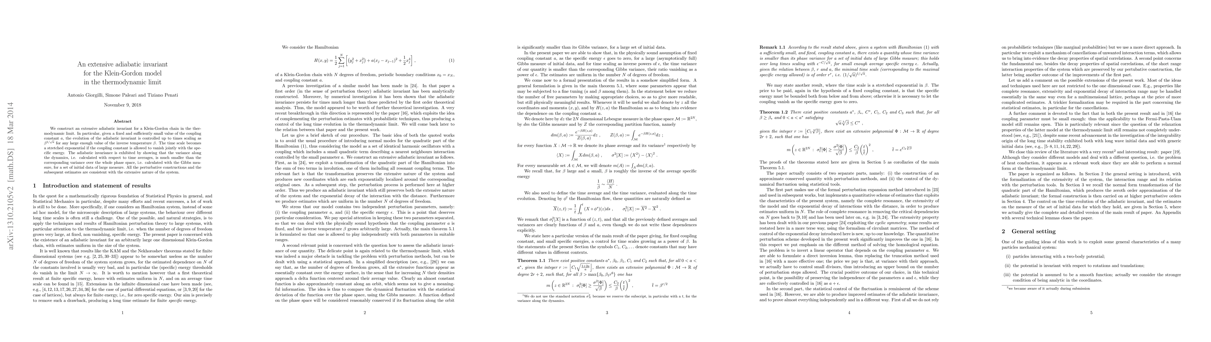 This paper constructs an extensive adiabatic invariant for a Klein-Gordon chain in the thermodynamic limit, demonstrating its invariance over time scales scaling as $\beta^{1/\sqrt{a}}$ for large inverse temperatures $\beta$. The variance along the dynamics is shown to be much smaller than the variance over the entire phase space, confirming the adiabatic invariance.