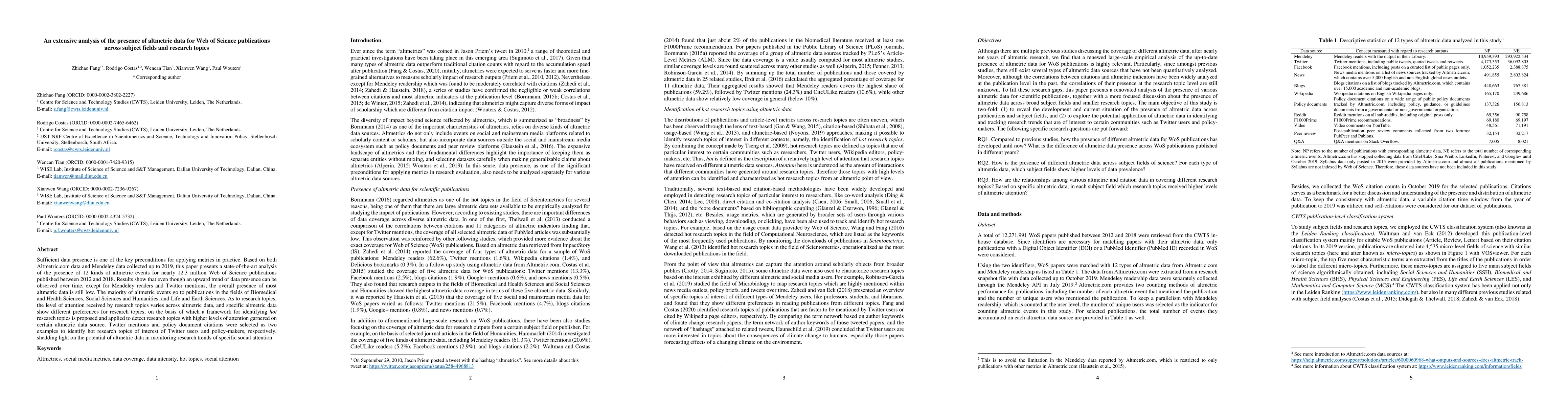 This paper analyzes the presence of altmetric data for nearly 12.3 million Web of Science publications from 2012 to 2018, revealing a low overall presence despite an upward trend, with Biomedical and Social Sciences receiving the most attention. It proposes a framework to identify hot research topics based on altmetric data, highlighting Twitter mentions and policy document citations as examples.