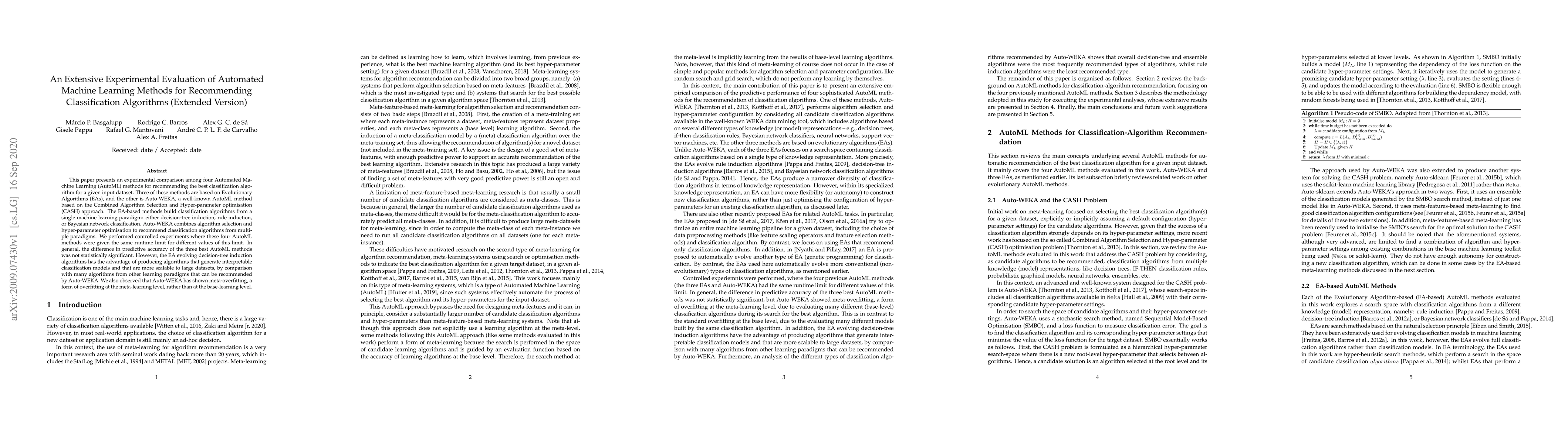 This paper presents an experimental comparison among four Automated Machine Learning (AutoML) methods for recommending the best classification algorithm for a given input dataset. Three of these methods are based on Evolutionary Algorithms (EAs), and the other is Auto-WEKA, a well-known AutoML method based on the Combined Algorithm Selection and Hyper-parameter optimisation (CASH) approach. The EA-based methods build classification algorithms from a single machine learning paradigm: either decision-tree induction, rule induction, or Bayesian network classification. Auto-WEKA combines algorithm selection and hyper-parameter optimisation to recommend classification algorithms from multiple paradigms. We performed controlled experiments where these four AutoML methods were given the same runtime limit for different values of this limit. In general, the difference in predictive accuracy of the three best AutoML methods was not statistically significant. However, the EA evolving decision-tree induction algorithms has the advantage of producing algorithms that generate interpretable classification models and that are more scalable to large datasets, by comparison with many algorithms from other learning paradigms that can be recommended by Auto-WEKA. We also observed that Auto-WEKA has shown meta-overfitting, a form of overfitting at the meta-learning level, rather than at the base-learning level.