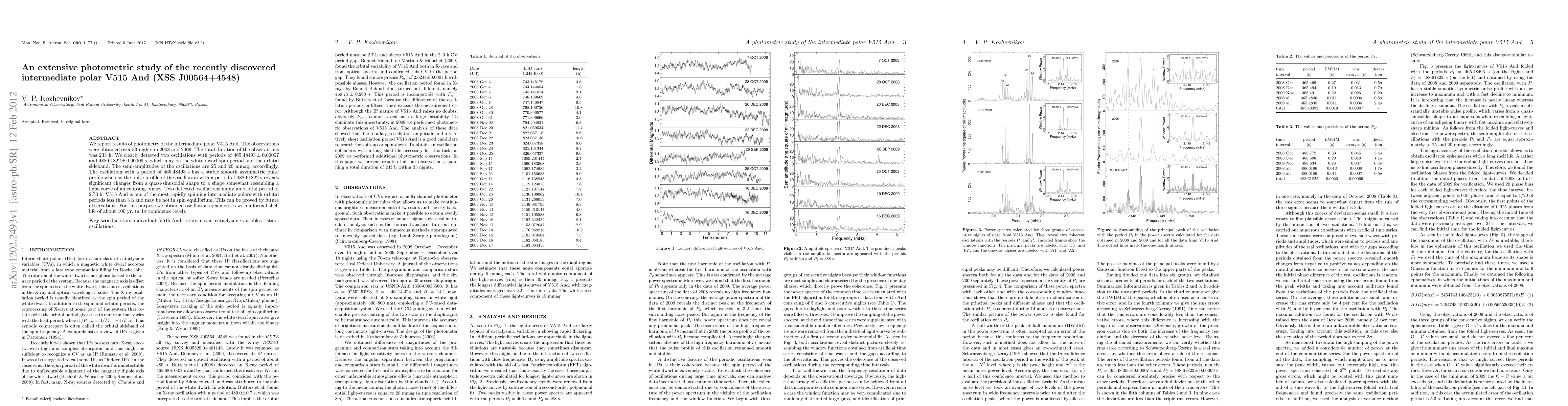 We report results of photometry of the intermediate polar V515 And. The observations were obtained over 33 nights in 2008 and 2009. The total duration of the observations was 233 h. We clearly detected two oscillations with periods of 465.48493\pm0.00007$ and 488.61822\pm0.00009 s, which may be the white dwarf spin period and the orbital sideband. The semi-amplitudes of the oscillations are 25 and 20 mmag, accordingly. The oscillation with a period of 465.48493 s has a stable smooth asymmetric pulse profile whereas the pulse profile of the oscillation with a period of 488.61822 s reveals significant changes from a quasi-sinusoidal shape to a shape somewhat resembling a light-curve of an eclipsing binary. Two detected oscillations imply an orbital period of 2.73 h. V515 And is one of the most rapidly spinning intermediate polars with orbital periods less than 3 h and may be not in spin equilibrium. This can be proved by future observations. For this purpose we obtained oscillation ephemerises with a formal shelf life of about 100 yr. (a 1 sigma confidence level).