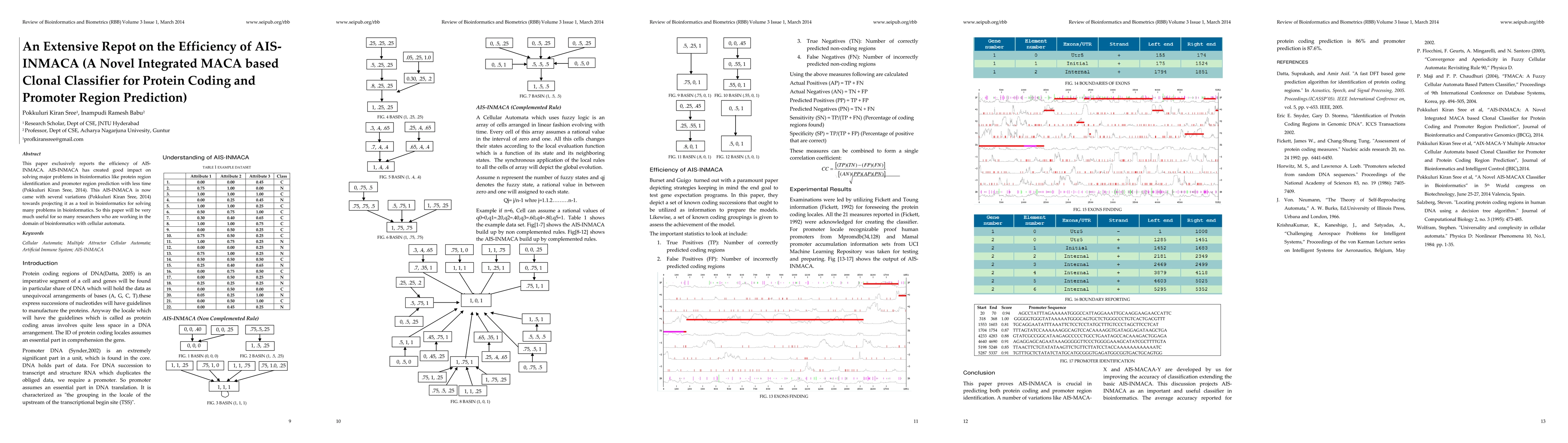 This paper exclusively reports the efficiency of AIS-INMACA. AIS-INMACA has created good impact on solving major problems in bioinformatics like protein region identification and promoter region prediction with less time (Pokkuluri Kiran Sree, 2014). This AIS-INMACA is now came with several variations (Pokkuluri Kiran Sree, 2014) towards projecting it as a tool in bioinformatics for solving many problems in bioinformatics. So this paper will be very much useful for so many researchers who are working in the domain of bioinformatics with cellular automata.