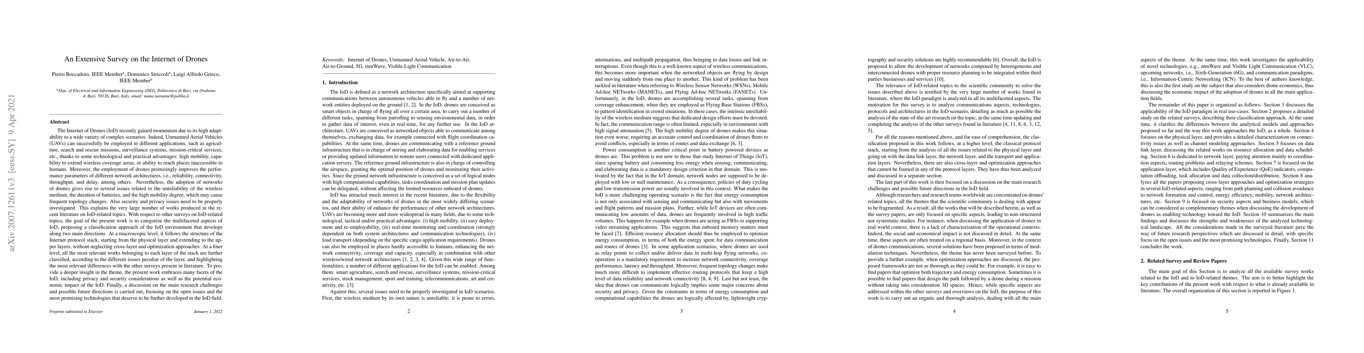 The Internet of Drones (IoD) recently gained momentum due to its high adaptability to a wide variety of complex scenarios. Indeed, Unmanned Aerial Vehicles (UAVs) can successfully be employed in different applications, thanks to some technological and practical advantages: high mobility, capability to extend wireless coverage areas, or ability to reach places inaccessible to humans. Moreover, the employment of drones promisingly improves the performance parameters of different network architectures. Nevertheless, the adoption of networks of drones gives rise to several issues related to the unreliability of the wireless medium, the duration of batteries, and the high mobility degree, which may cause frequent topology changes. Also security and privacy issues need to be properly investigated. With respect to other surveys on IoD-related topics, the goal of the present work is to categorize the multifaceted aspects of IoD, proposing a classification approach of the IoD environment that develops along two main directions. At a macroscopic level, it follows the structure of the Internet protocol stack, starting from the physical layer and extending to the upper layers, without neglecting cross-layer and optimization approaches. At a finer level, all the most relevant works belonging to each layer of the stack are further classified, according to the different issues peculiar of the layer, and highlighting the most relevant differences with the other surveys present in literature. To provide a deeper insight in the theme, the present work embraces many facets of the IoD, including privacy and security considerations as well as the potential economic impact of the IoD. Finally, a discussion on the main research challenges and possible future directions is carried out, focusing on the open issues and the most promising technologies that deserve to be further developed in the IoD field.