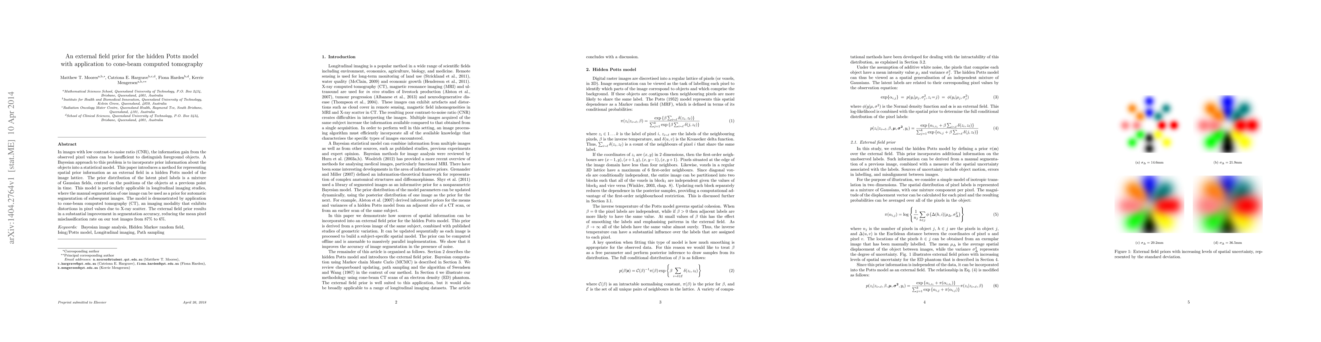 In images with low contrast-to-noise ratio (CNR), the information gain from the observed pixel values can be insufficient to distinguish foreground objects. A Bayesian approach to this problem is to incorporate prior information about the objects into a statistical model. This paper introduces a method for representing spatial prior information as an external field in a hidden Potts model of the image lattice. The prior distribution of the latent pixel labels is a mixture of Gaussian fields, centred on the positions of the objects at a previous point in time. This model is particularly applicable in longitudinal imaging studies, where the manual segmentation of one image can be used as a prior for automatic segmentation of subsequent images. The model is demonstrated by application to cone-beam computed tomography (CT), an imaging modality that exhibits distortions in pixel values due to X-ray scatter. The external field prior results in a substantial improvement in segmentation accuracy, reducing the mean pixel misclassification rate on our test images from 87% to 6%.