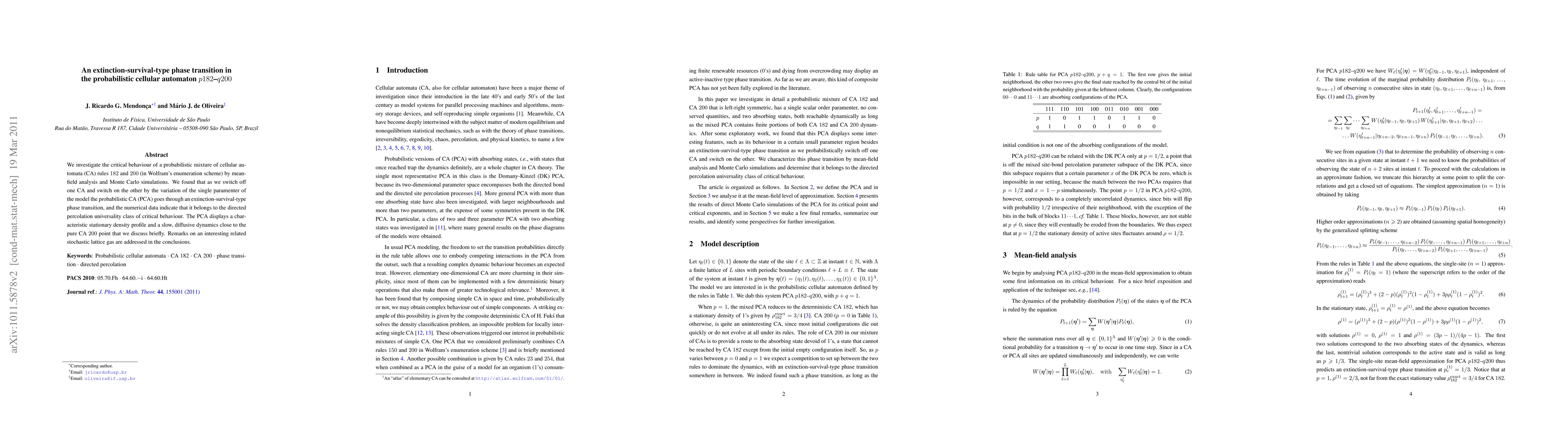 Researchers investigated the probabilistic cellular automaton p182-q200 and found it undergoes an extinction-survival phase transition when switching between rules 182 and 200, exhibiting critical behavior similar to directed percolation.