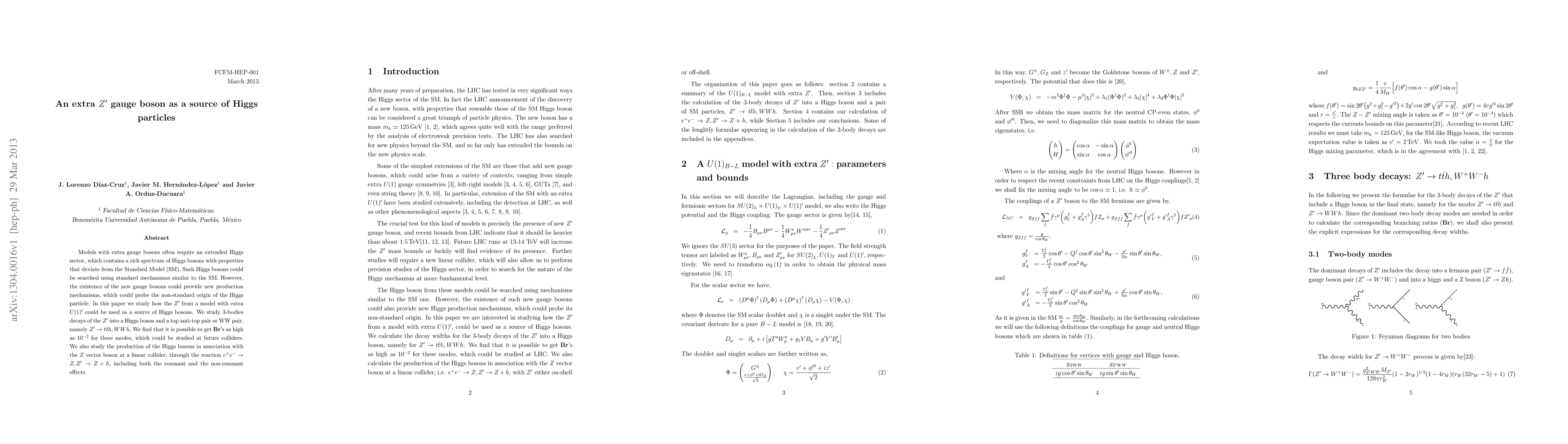 This paper explores the potential of an extra Z' gauge boson in models with an extended U(1)' symmetry to generate Higgs particles through unique decay and production mechanisms. It investigates Z' decays into Higgs and top-antitop pairs or WW pairs, finding significant branching ratios, and examines Higgs production in association with Z bosons at linear colliders.