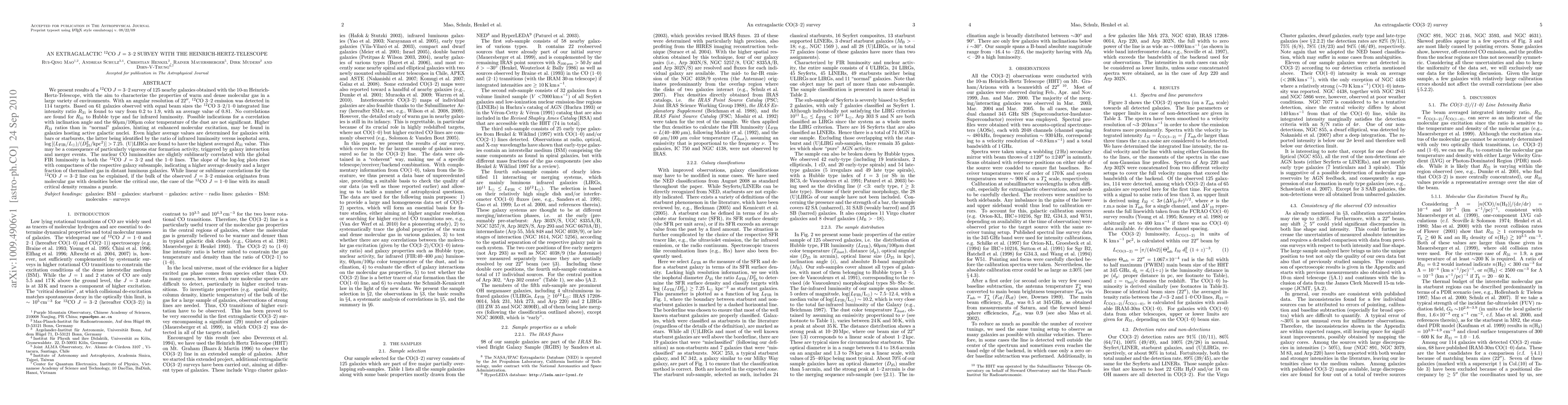 We present results of a ^{12}CO J = 3-2 survey of 125 nearby galaxies obtained with the 10-m Heinrich-Hertz-Telescope, with the aim to characterize the properties of warm and dense molecular gas in a large variety of environments. With an angular resolution of 22'', ^{12}CO 3-2 emission was detected in 114 targets. Based on 61 galaxies observed with equal beam sizes the ^{12}CO 3-2/1-0 integrated line intensity ratio R_{31} is found to vary from 0.2 to 1.9, with an average value of 0.81. No correlations are found for R_{31} to Hubble type and far infrared luminosity. Possible indications for a correlation with inclination angle and the 60mum/100mum color temperature of the dust are not significant. Higher R_{31} ratios than in ``normal'' galaxies, hinting at enhanced molecular excitation, may be found in galaxies hosting active galactic nuclei. Even higher average values are determined for galaxies with bars or starbursts, the latter being identified by the ratio of infrared luminosity versus isophotal area, log[(L_{FIR}/L_{SUN})/(D_{25}/kpc)^2)] > 7.25. (U)LIRGs are found to have the highest averaged R_{31} value. This may be a consequence of particularly vigorous star formation activity, triggered by galaxy interaction and merger events. The nuclear CO luminosities are slightly sublinearly correlated with the global FIR luminosity in both the ^{12}CO J = 3-2 and the 1-0 lines. The slope of the log-log plots rises with compactness of the respective galaxy subsample, indicating a higher average density and a larger fraction of thermalized gas in distant luminous galaxies. While linear or sublinear correlations for the ^{12}CO J = 3-2 line can be explained, if the bulk of the observed J = 3-2 emission originates from molecular gas with densities below the critical one, the case of the ^{12}CO J = 1-0 line with its small critical density remains a puzzle.