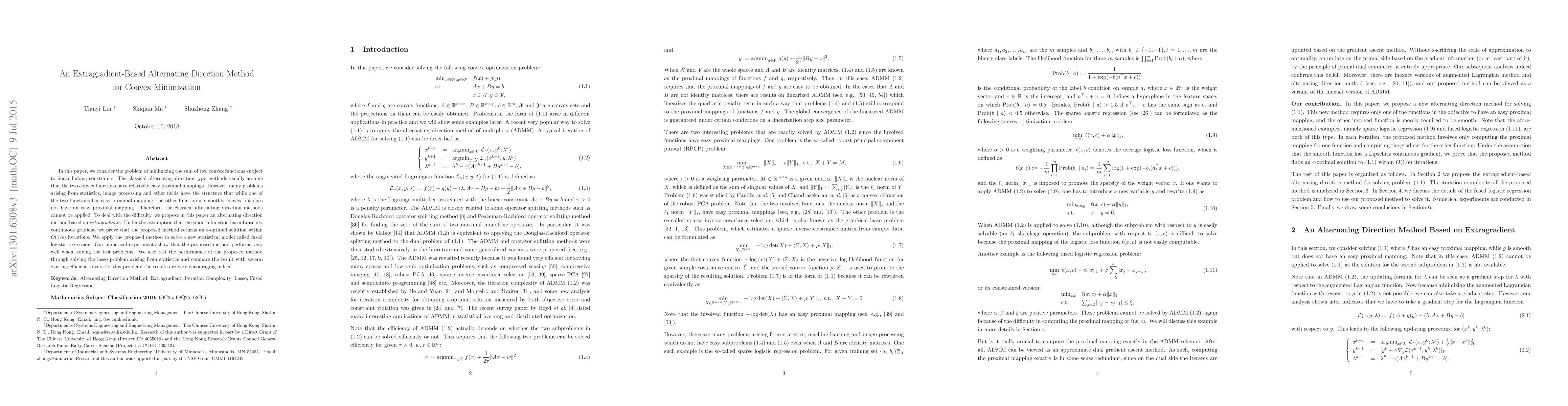 In this paper, we consider the problem of minimizing the sum of two convex functions subject to linear linking constraints. The classical alternating direction type methods usually assume that the two convex functions have relatively easy proximal mappings. However, many problems arising from statistics, image processing and other fields have the structure that while one of the two functions has easy proximal mapping, the other function is smoothly convex but does not have an easy proximal mapping. Therefore, the classical alternating direction methods cannot be applied. To deal with the difficulty, we propose in this paper an alternating direction method based on extragradients. Under the assumption that the smooth function has a Lipschitz continuous gradient, we prove that the proposed method returns an $\epsilon$-optimal solution within $O(1/\epsilon)$ iterations. We apply the proposed method to solve a new statistical model called fused logistic regression. Our numerical experiments show that the proposed method performs very well when solving the test problems. We also test the performance of the proposed method through solving the lasso problem arising from statistics and compare the result with several existing efficient solvers for this problem; the results are very encouraging indeed.
