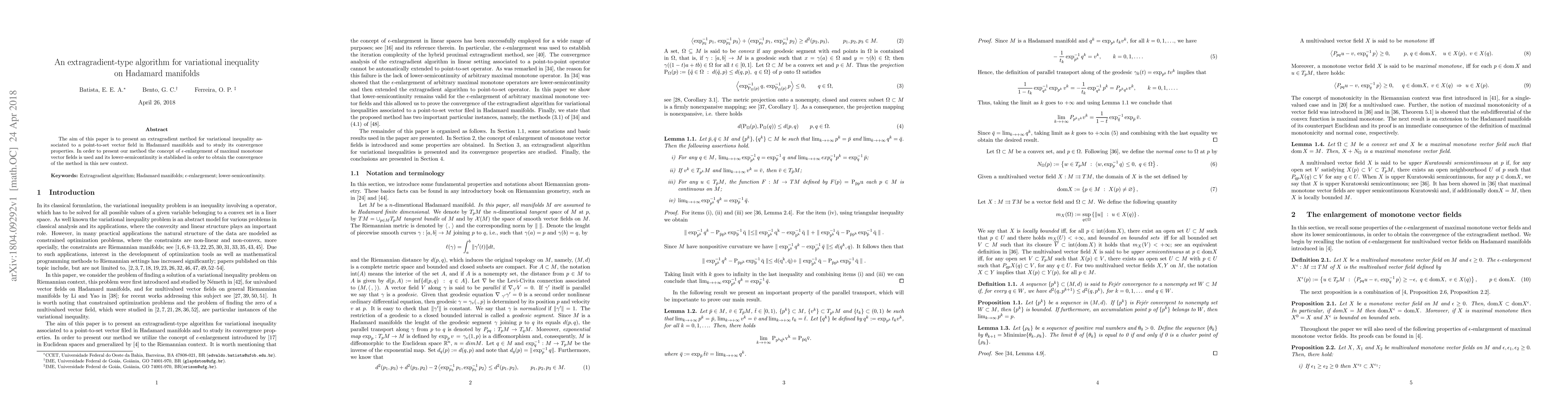 Summary: This paper introduces an extragradient algorithm for solving variational inequalities on Hadamard manifolds, establishing convergence via $\epsilon$-enlargement of maximal monotone vector fields and proving its lower-semicontinuity. The method's effectiveness and convergence properties are analyzed in the context of Hadamard manifolds.