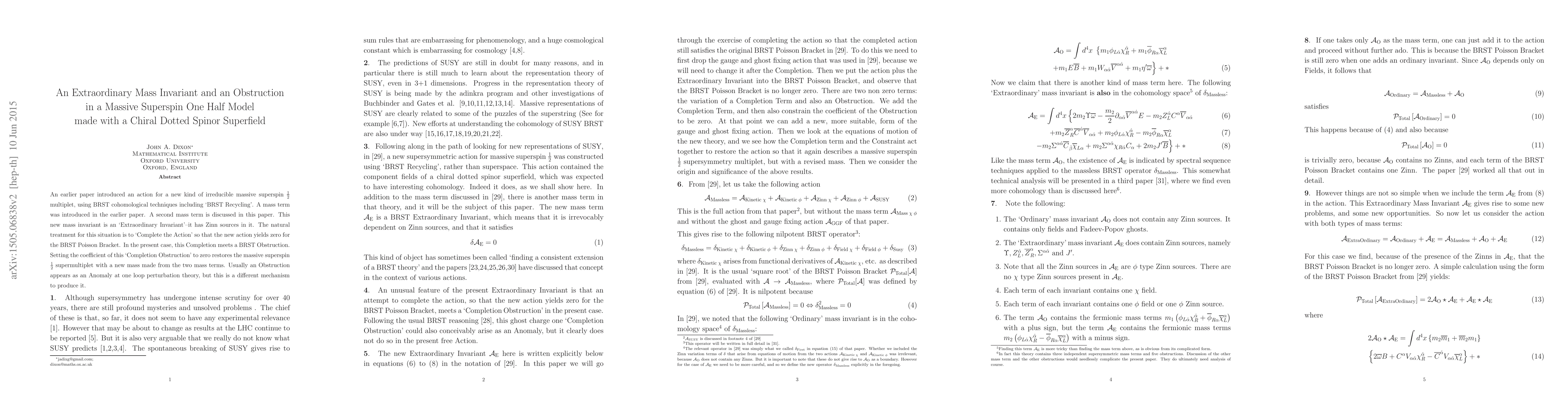 An earlier paper introduced an action for a new kind of irreducible massive superspin one half multiplet, using BRST cohomological techniques including `BRST Recycling'. A mass term was introduced in the earlier paper. A second mass term is discussed in this paper. This new mass invariant is an `Extraordinary Invariant'--it has Zinn sources in it. The natural treatment for this situation is to `Complete the Action' so that the new action yields zero for the BRST Poisson Bracket. In the present case, this Completion meets a BRST Obstruction. Setting the coefficient of this `Completion Obstruction' to zero restores the massive superspin one half supermultiplet with a new mass made from the two mass terms. Usually an Obstruction appears as an Anomaly at one loop perturbation theory, but this is a different mechanism to produce it.