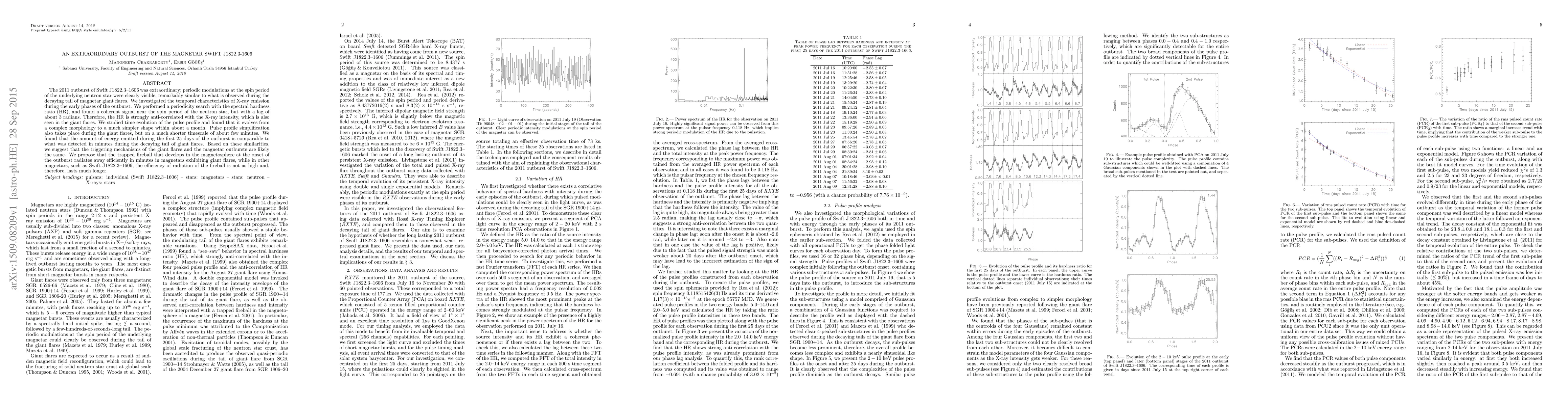 The 2011 outburst of Swift J1822.3-1606 exhibited periodic modulations similar to magnetar giant flares, with a coherent signal near the neutron star's spin period and an anti-correlated spectral hardness ratio. The pulse profile simplified over a month, suggesting similar triggering mechanisms for giant flares and the magnetar outbursts, with differing efficiencies of radiation.