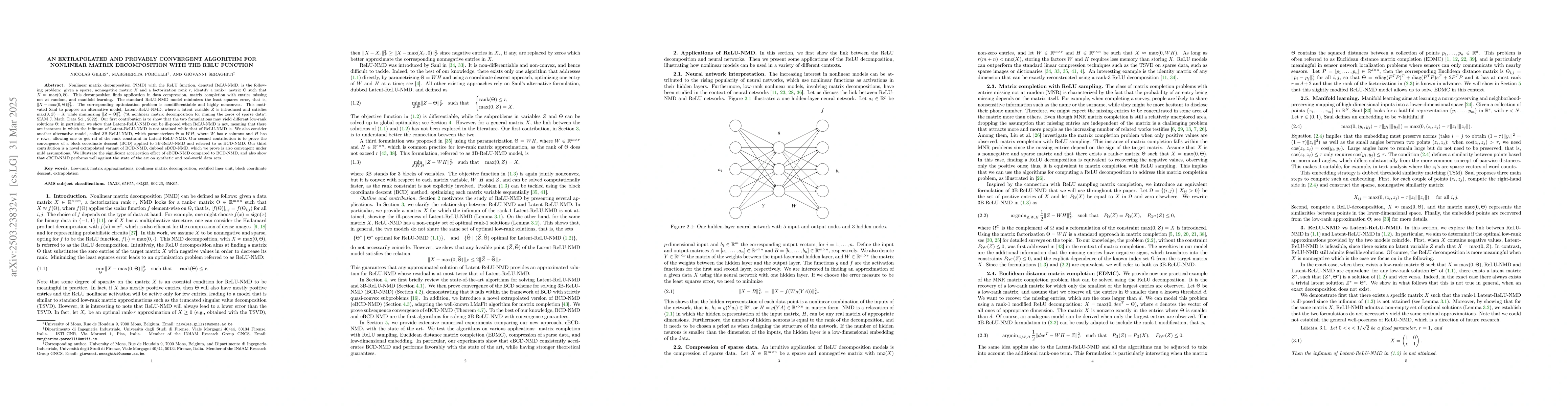 This paper proposes an extrapolated and provably convergent algorithm for nonlinear matrix decomposition using the ReLU function. It introduces an alternative model, 3B-ReLU-NMD, and proves the convergence of its block coordinate descent variant, eBCD-NMD, demonstrating significant performance improvements over standard methods on both synthetic and real-world datasets.