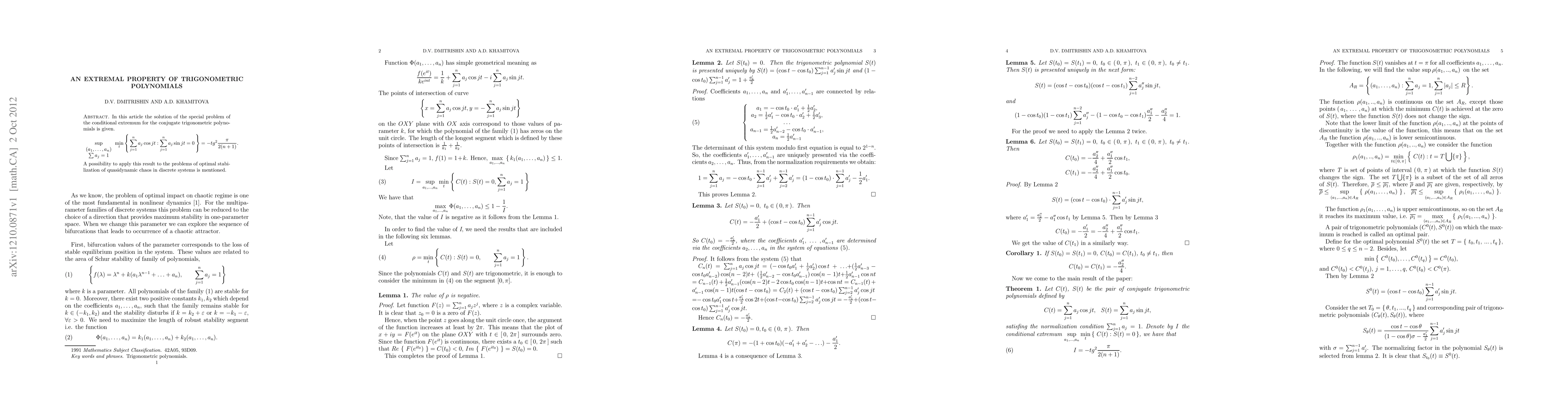 In this article the solution of the special problem of the conditional extremum for the conjugate trigonometric polynomials is given. A possibility to apply this result to the problems of optimal stabilization of quasidynamic chaos in discrete systems is mentioned.