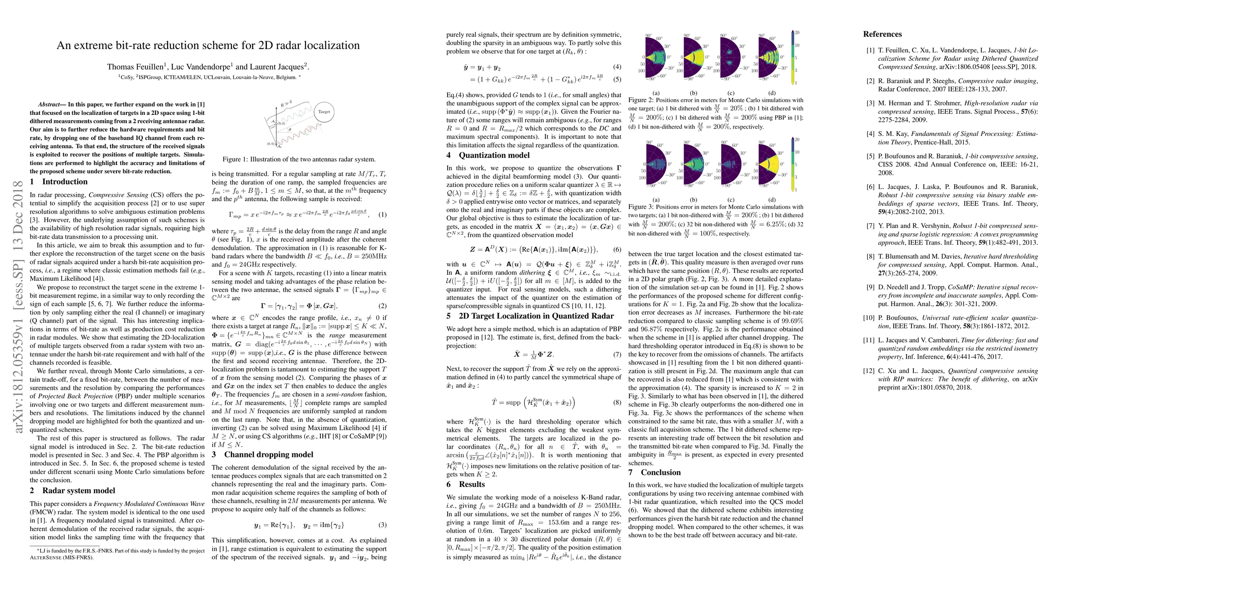 This paper proposes an advanced scheme for 2D radar localization using 1-bit dithered measurements, reducing hardware requirements and bit-rate by eliminating one baseband IQ channel per antenna. Simulations demonstrate the accuracy and limitations of the method under extreme bit-rate reduction.