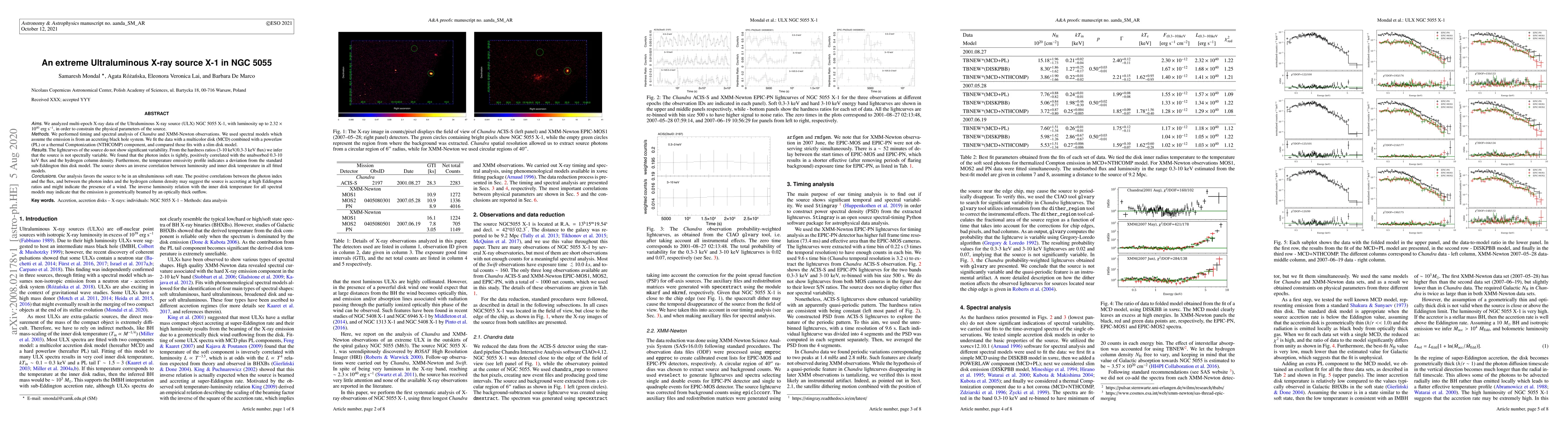 Aims. We analyzed multi-epoch X-ray data of the Ultraluminous X-ray source (ULX) NGC 5055 X-1, with luminosity up to $2.32\times10^{40}\ \rm erg\ s^{-1}$, in order to constrain the physical parameters of the source. Methods. We performed timing and spectral analysis of Chandra and XMM-Newton observations. We used spectral models which assume the emission is from an accreting black hole system. We fit the data with a multicolor disk (MCD) combined with a powerlaw (PL) or a thermal Comptonization (NTHCOMP) component, and compared those fits with a slim disk model. Results. The lightcurves of the source do not show significant variability. From the hardness ratios (3-10 keV/0.3-3 keV flux) we infer that the source is not spectrally variable. We found that the photon index is tightly, positively correlated with the unabsorbed 0.3-10 keV flux and the hydrogen column density. Furthermore, the temperature emissivity profile indicates a deviation from the standard sub-Eddington thin disk model. The source shows an inverse correlation between luminosity and inner disk temperature in all fitted models. Conclusions. Our analysis favors the source to be in an ultraluminous soft state. The positive correlations between the photon index and the flux, and between the photon index and the hydrogen column density may suggest the source is accreting at high Eddington ratios and might indicate the presence of a wind. The inverse luminosity relation with the inner disk temperature for all spectral models may indicate that the emission is geometrically beamed by an optically thick outflow.