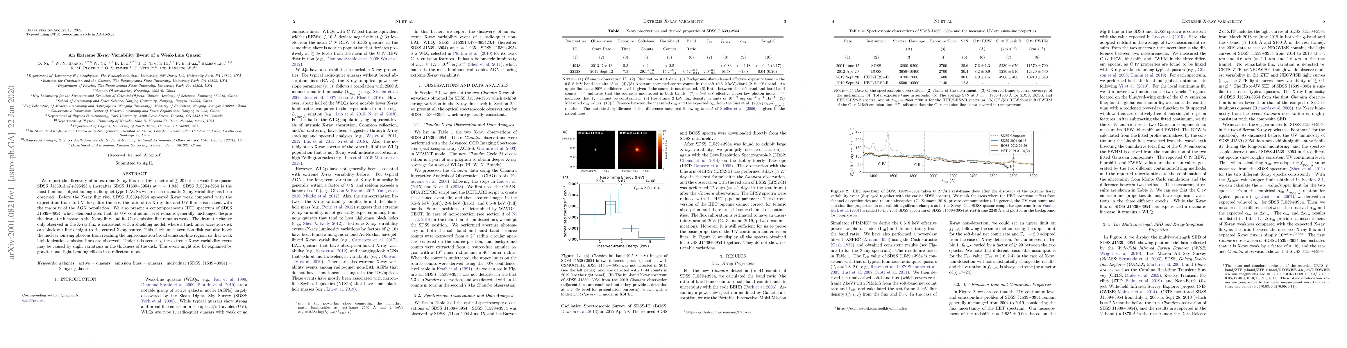 This paper reports an extreme X-ray flux rise by a factor of > 20 in the weak-line quasar SDSS J1539+3954, suggesting a shielding model where a thick inner accretion disk temporarily blocks the X-ray source, causing the observed X-ray variability. The UV continuum remains unchanged, indicating the variability is specific to X-rays.