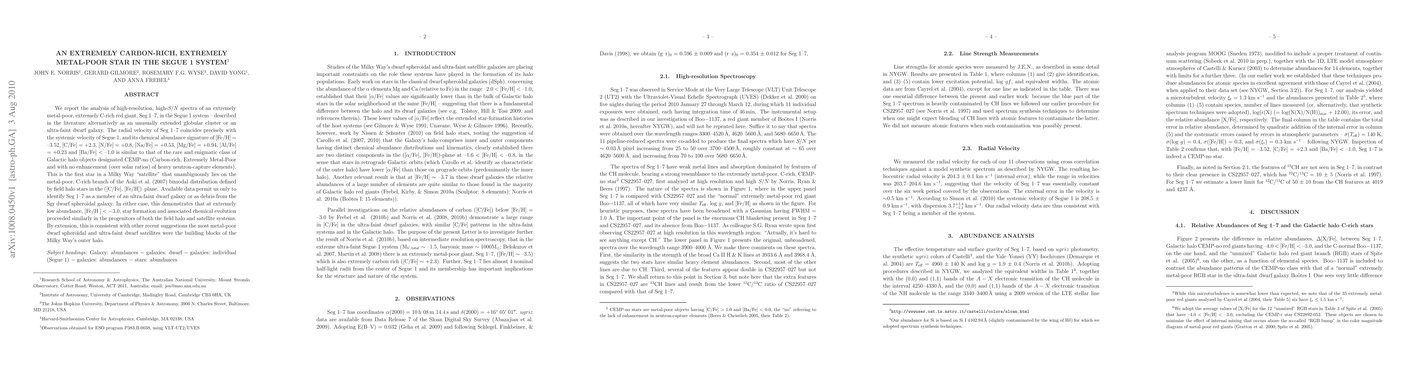 This paper identifies an extremely carbon-rich, extremely metal-poor star, Seg 1-7, in the Segue 1 system, which shares the rare CEMP-no chemical signature. This star's discovery supports the idea that the low-abundance star formation processes in the progenitors of both field halo and satellite systems were similar.