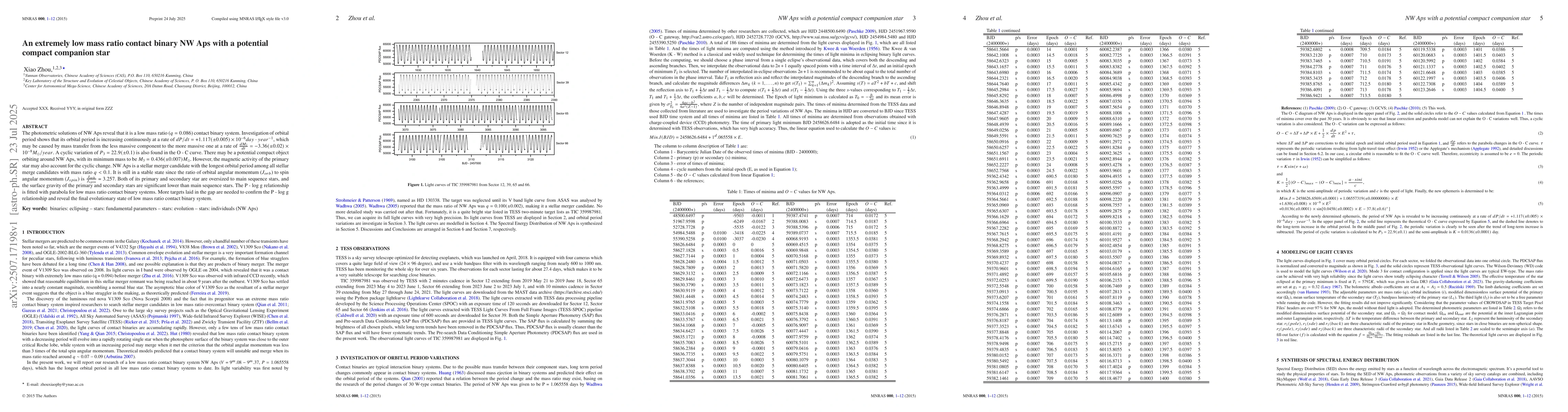 The photometric solutions of NW Aps reveal that it is a low mass ratio ($q = 0.086$) contact binary system. Investigation of orbital period shows that its orbital period is increasing continuously at a rate of $dP/dt=+1.117(\pm0.005)\times{10^{-6}}day\cdot year^{-1}$, which may be caused by mass transfer from the less massive component to the more massive one at a rate of $\frac{dM_{2}}{dt}=-3.36(\pm0.02)\times{10^{-8}}M_\odot/year$. A cyclic variation of $P_3 = 22.9(\pm0.1)$ is also found in the O - C curve. There may be a potential compact object orbiting around NW Aps, with its minimum mass to be $M_3 = 0.436(\pm0.007)M_\odot$. However, the magnetic activity of the primary star may also account for the cyclic change. NW Aps is a stellar merger candidate with the longest orbital period among all stellar merge candidates with mass ratio $q < 0.1$. It is still in a stable state since the ratio of orbital angular momentum ($J_{orb}$) to spin angular momentum ($J_{spin}$) is $\frac{J_{orb}}{J_{spin}}$ = 3.257. Both of its primary and secondary star are oversized to main sequence stars, and the surface gravity of the primary and secondary stars are significant lower than main sequence stars. The P - log g relationship is fitted with parabola for low mass ratio contact binary systems. More targets laid in the gap are needed to confirm the P - log g relationship and reveal the final evolutionary state of low mass ratio contact binary system.