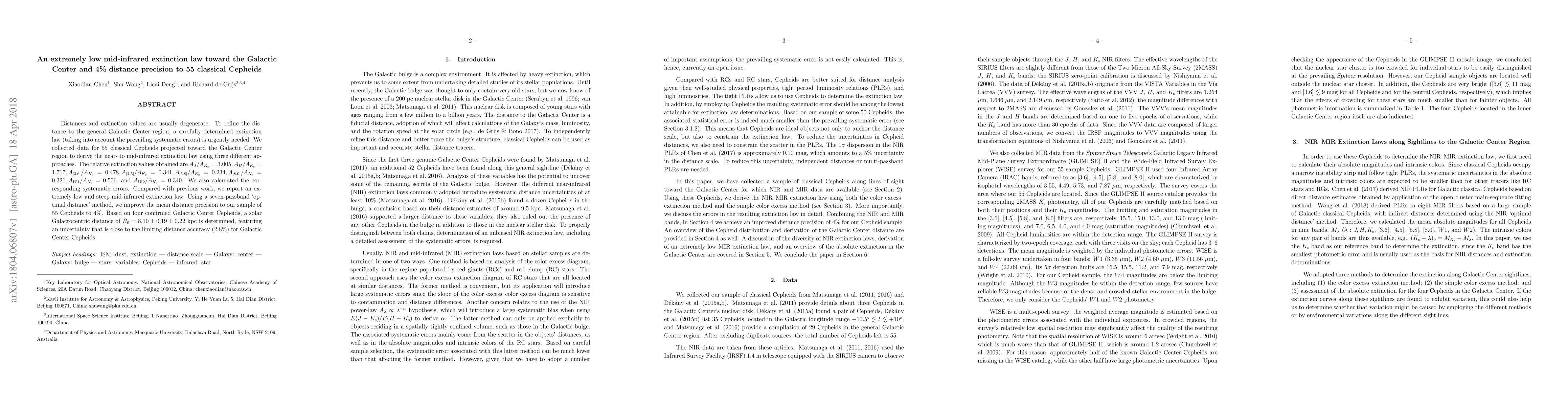 This paper presents a refined mid-infrared extinction law derived from data for 55 classical Cepheids near the Galactic Center, achieving a steep and low extinction curve. The study improves the distance precision to these Cepheids to 4%, leading to a solar Galactocentric distance estimate of R_0 = 8.10±0.19±0.22 kpc.
