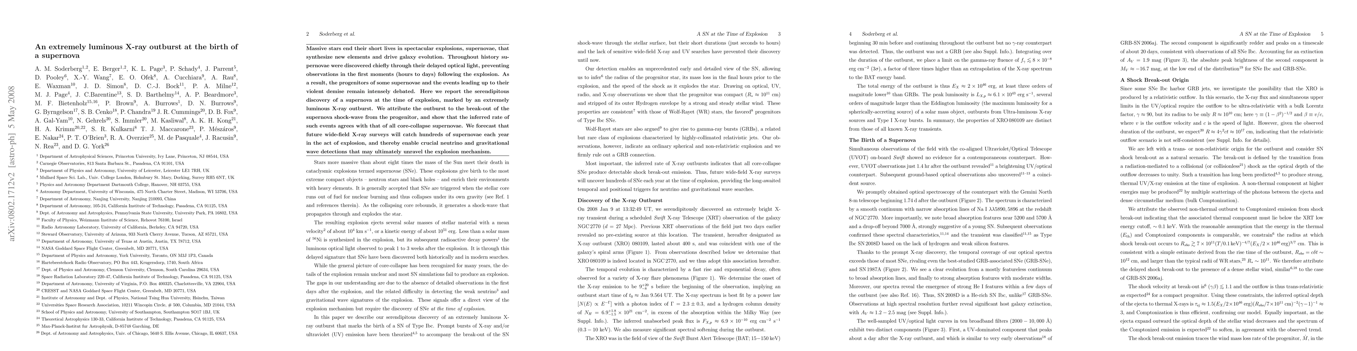 This paper reports the first detection of a supernova at the moment of explosion through an extremely luminous X-ray outburst, providing insights into the progenitors and early events of supernovae. The findings suggest that future X-ray surveys will significantly enhance our understanding of supernova mechanisms through real-time observations.