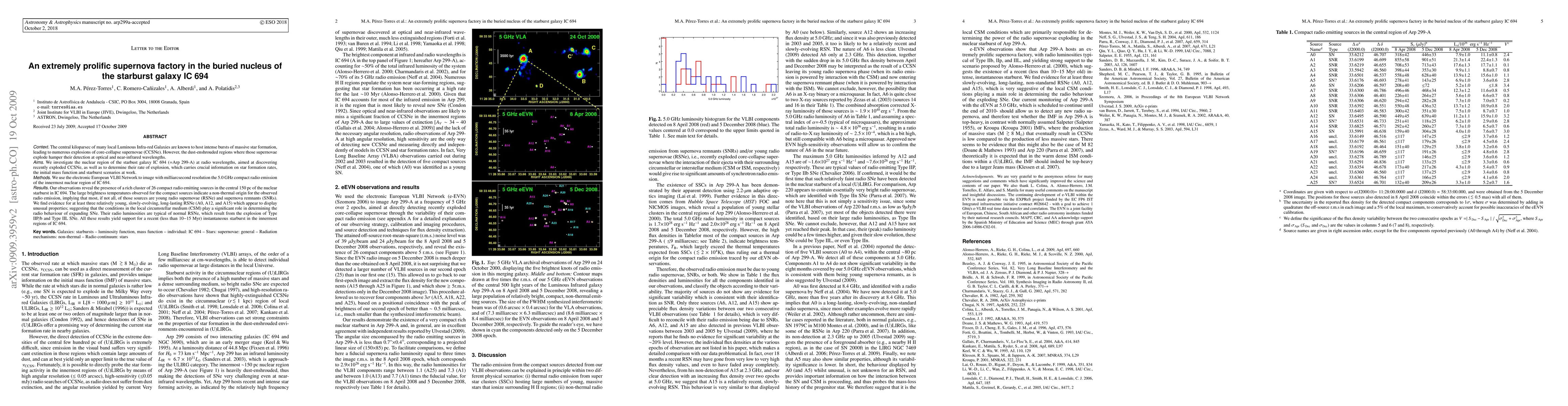 Context. The central kiloparsec of many local Luminous Infra-red Galaxies are known to host intense bursts of massive star formation, leading to numerous explosions of core-collapse supernovae (CCSNe). However, the dust-enshrouded regions where those supernovae explode hamper their detection at optical and near-infrared wavelengths. Aims. We investigate the nuclear region of the starbust galaxy IC 694 (=Arp 299-A) at radio wavelengths, aimed at discovering recently exploded CCSNe, as well as to determine their rate of explosion, which carries crucial information on star formation rates, the initial mass function and starburst scenarios at work. Methods. We use the electronic European VLBI Network to image with milliarcsecond resolution the 5.0 GHz compact radio emission of the innermost nuclear region of IC 694. Results. Our observations reveal the presence of a rich cluster of 26 compact radio emitting sources in the central 150 pc of the nuclear starburst in IC 694. The large brightness temperatures observed for the compact sources indicate a non-thermal origin for the observed radio emission, implying that most, if not all, of those sources are young radio supernovae (RSNe) and supernova remnants (SNRs). We find evidence for at least three relatively young, slowly-evolving, long-lasting RSNe (A0, A12, and A15) which appear to display unusual properties; suggesting that the conditions in the local circumstellar medium (CSM) play a significant role in determining the radio behaviour of expanding SNe. Their radio luminosities are typical of normal RSNe, which result from the explosion of Type IIP/b and Type IIL SNe. All these results yield support for a recent (less than 10-15 Myr) instantaneous starburst in the innermost regions of IC 694.