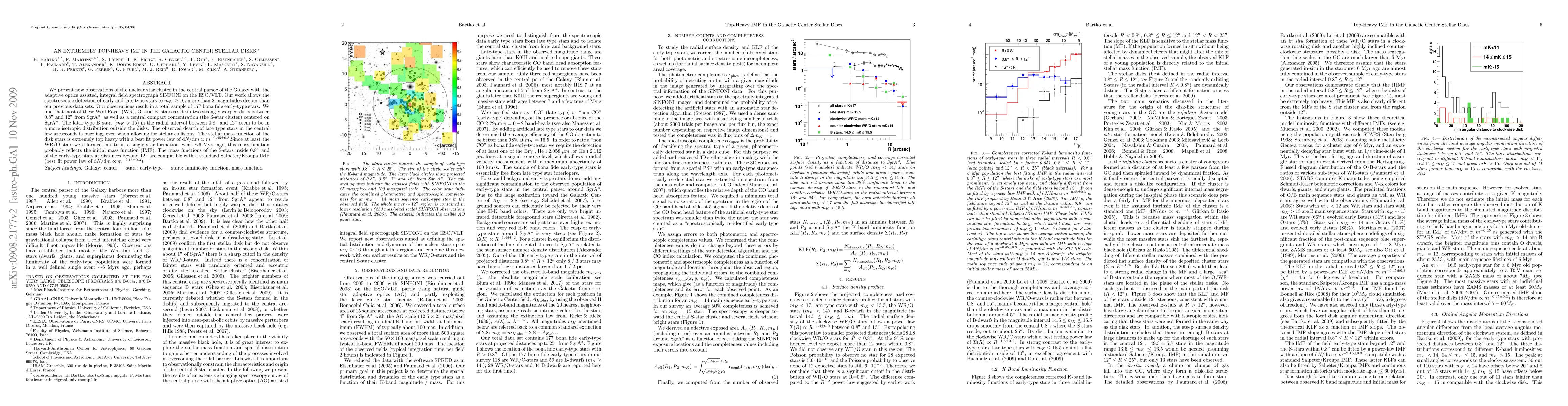 We present new observations of the nuclear star cluster in the central parsec of the Galaxy with the adaptive optics assisted, integral field spectrograph SINFONI on the ESO/VLT. Our work allows the spectroscopic detection of early and late type stars to m_K >= 16, more than 2 magnitudes deeper than our previous data sets. Our observations result in a total sample of 177 bona fide early-type stars. We find that most of these Wolf Rayet (WR), O- and B- stars reside in two strongly warped disks between 0.8" and 12" from SgrA*, as well as a central compact concentration (the S-star cluster) centered on SgrA*. The later type B stars (m_K>15) in the radial interval between 0.8" and 12" seem to be in a more isotropic distribution outside the disks. The observed dearth of late type stars in the central few arcseconds is puzzling, even when allowing for stellar collisions. The stellar mass function of the disk stars is extremely top heavy with a best fit power law of dN/dm ~ m^(-0.45+/-0.3). Since at least the WR/O-stars were formed in situ in a single star formation event ~6 Myrs ago, this mass function probably reflects the initial mass function (IMF). The mass functions of the S-stars inside 0.8" and of the early-type stars at distances beyond 12" are compatible with a standard Salpeter/Kroupa IMF (best fit power law of dN/dm ~ m^(-2.15+/-0.3)).