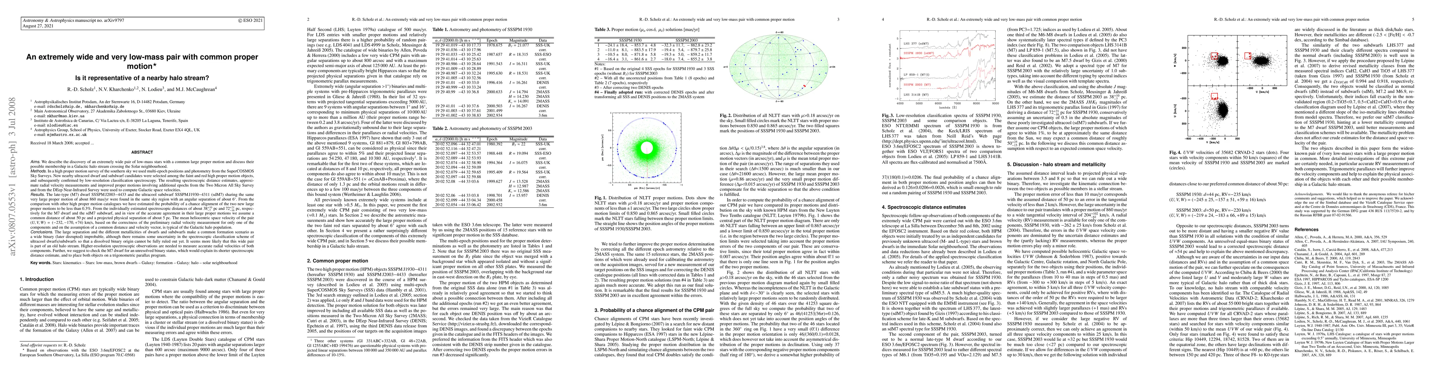 The research paper describes the discovery of an extremely wide pair of low-mass stars, SSSPM J2003-4433 (M7 dwarf) and SSSPM J1930-4311 (sdM7 subdwarf), sharing a common large proper motion of 860 mas/yr. With estimated distances of approximately 38±7 pc and 72±16 pc, their common distance is assumed to be around 50 pc. The pair's mean heliocentric space velocity (-232, -170, +74) km/s aligns with the Galactic halo population. The authors suggest this wide pair might be part of an old halo stream, rather than a wide binary system, due to their large separation and different metallicities.