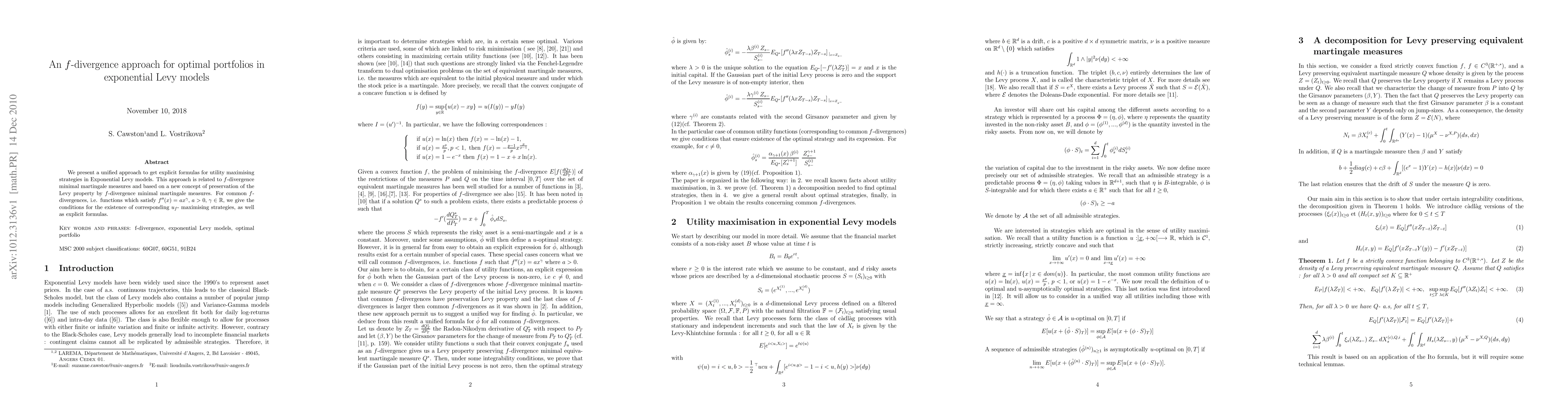This paper introduces an $f$-divergence approach to derive explicit formulas for utility-maximizing strategies in Exponential Lévy models, leveraging minimal martingale measures and the preservation of the Lévy property. It provides conditions for the existence and explicit forms of $u_f$-maximizing strategies for common $f$-divergences.