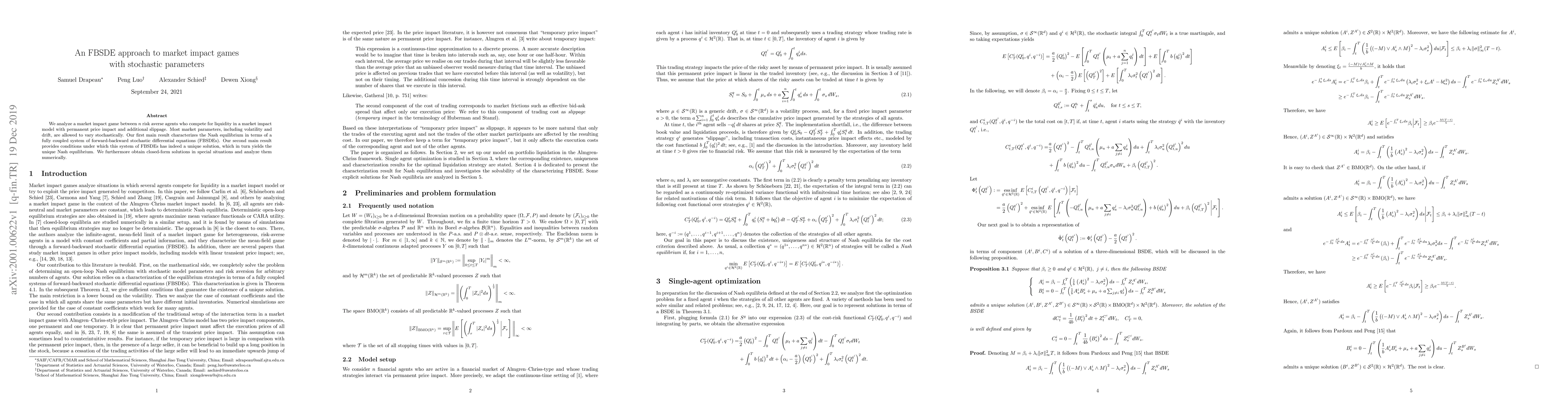 This paper studies a market impact game with $n$ risk-averse agents competing for liquidity, where market parameters are stochastic. It characterizes the Nash equilibrium via a fully coupled FBSDE system and proves the uniqueness of this equilibrium under certain conditions.