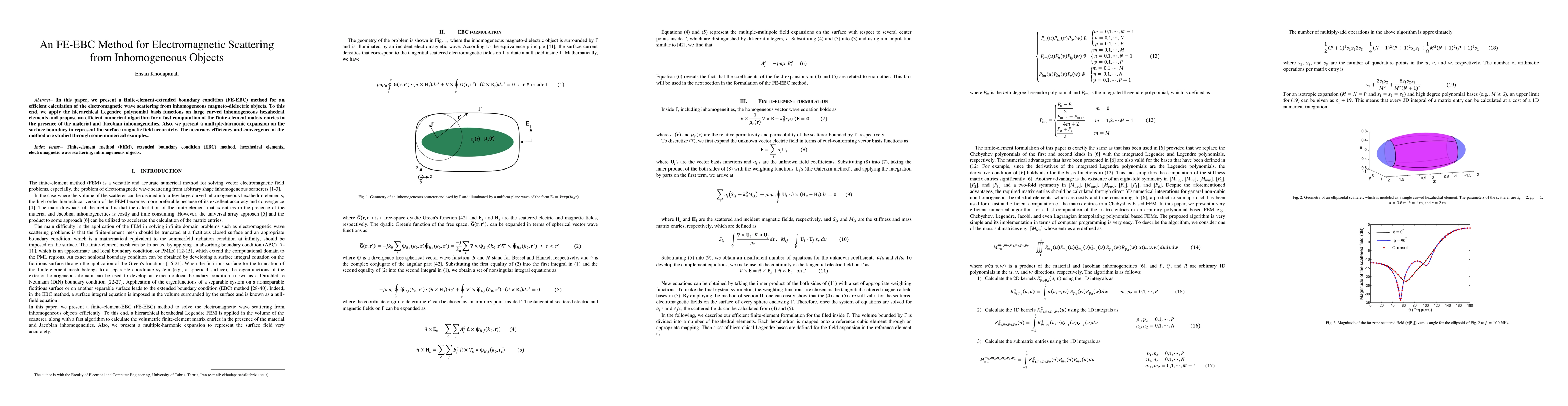 This paper introduces an FE-EBC method for calculating electromagnetic scattering from inhomogeneous objects using hierarchical Legendre polynomials and a multiple-harmonic expansion. The method demonstrates accuracy, efficiency, and convergence through numerical examples.