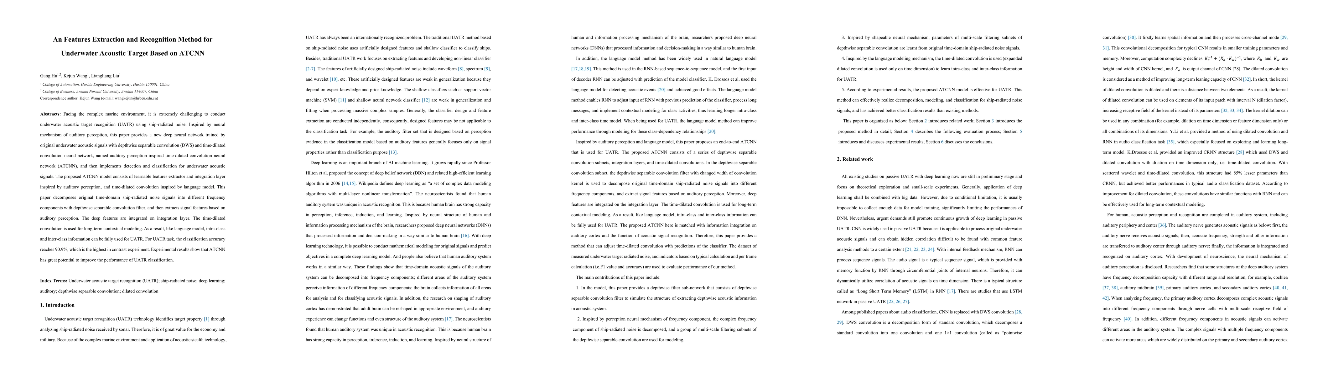 This paper proposes a novel ATCNN model for underwater acoustic target recognition, utilizing depthwise separable convolution and time-dilated convolution inspired by auditory perception and language models. The ATCNN achieves a high classification accuracy of 90.9%, demonstrating significant potential for improving underwater acoustic target recognition.
