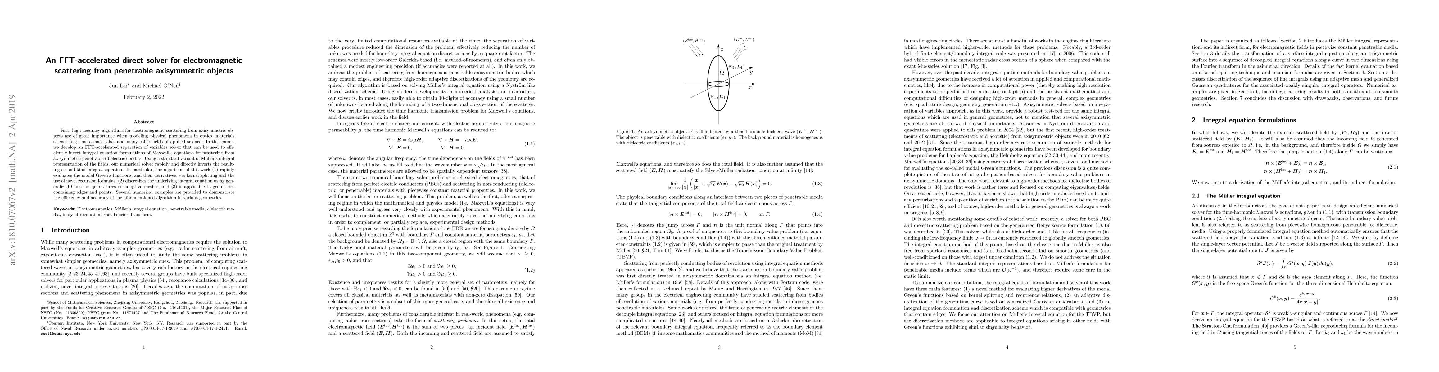 This paper presents an FFT-accelerated solver for electromagnetic scattering from axisymmetric penetrable objects, utilizing separation of variables and efficient inversion of integral equations based on Maxwell's equations. The method rapidly evaluates modal Green's functions and is applicable to complex geometries, demonstrated through numerical examples.