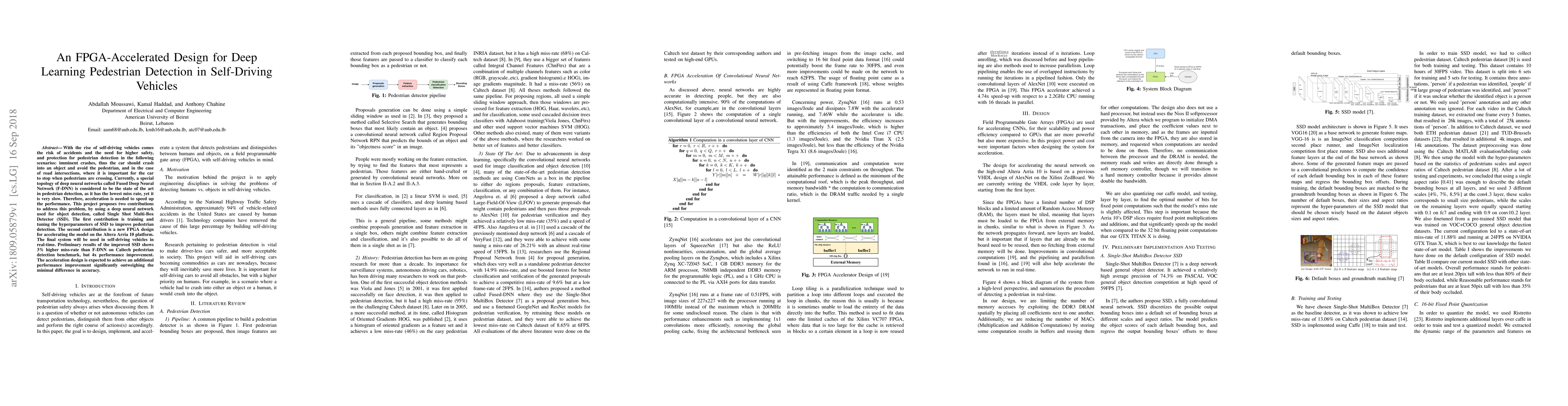 With the rise of self-driving vehicles comes the risk of accidents and the need for higher safety, and protection for pedestrian detection in the following scenarios: imminent crashes, thus the car should crash into an object and avoid the pedestrian, and in the case of road intersections, where it is important for the car to stop when pedestrians are crossing. Currently, a special topology of deep neural networks called Fused Deep Neural Network (F-DNN) is considered to be the state of the art in pedestrian detection, as it has the lowest miss rate, yet it is very slow. Therefore, acceleration is needed to speed up the performance. This project proposes two contributions to address this problem, by using a deep neural network used for object detection, called Single Shot Multi-Box Detector (SSD). The first contribution is training and tuning the hyperparameters of SSD to improve pedestrian detection. The second contribution is a new FPGA design for accelerating the model on the Altera Arria 10 platform. The final system will be used in self-driving vehicles in real-time. Preliminary results of the improved SSD shows 3% higher miss-rate than F-DNN on Caltech pedestrian detection benchmark, but 4x performance improvement. The acceleration design is expected to achieve an additional performance improvement significantly outweighing the minimal difference in accuracy.