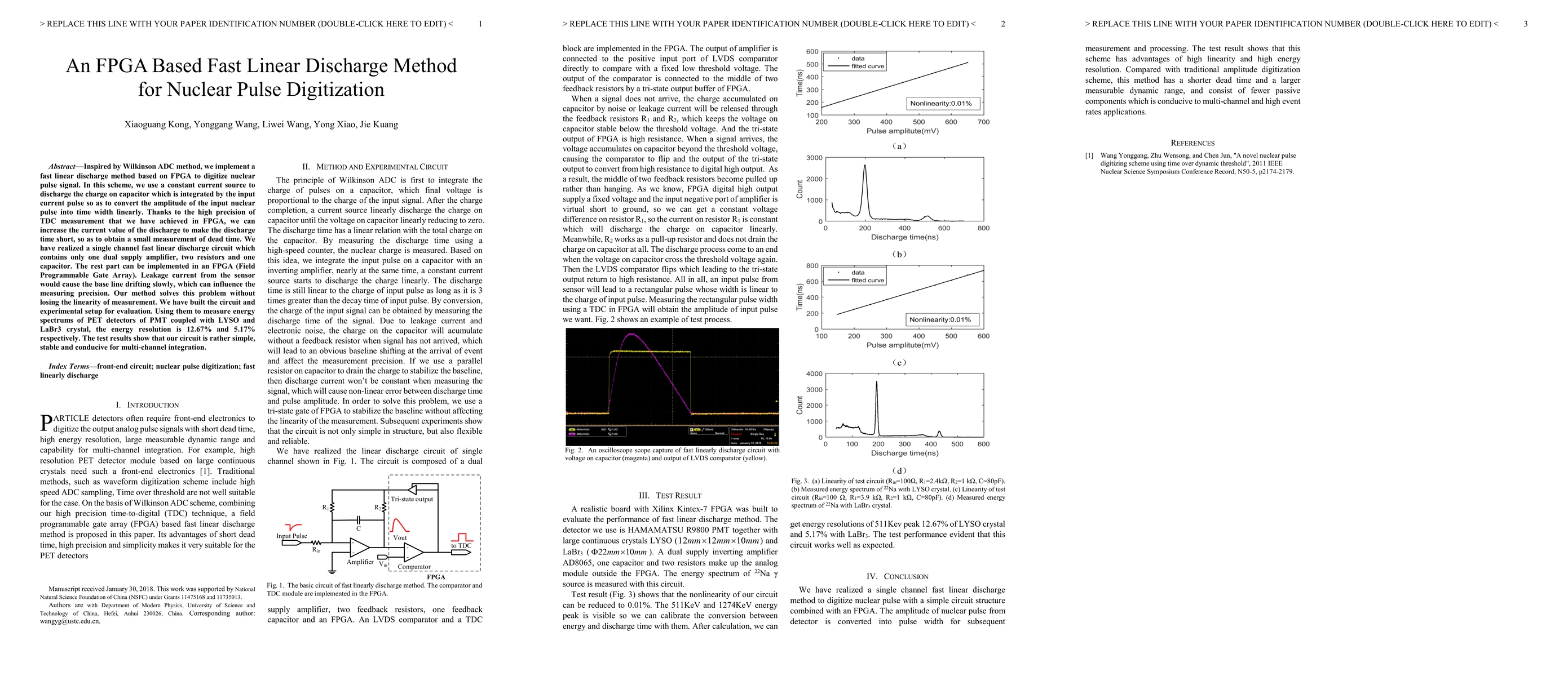 Researchers developed a fast linear discharge method using FPGA to digitize nuclear pulse signals, achieving an energy resolution of 12.67% for PET detectors with high precision and stability.