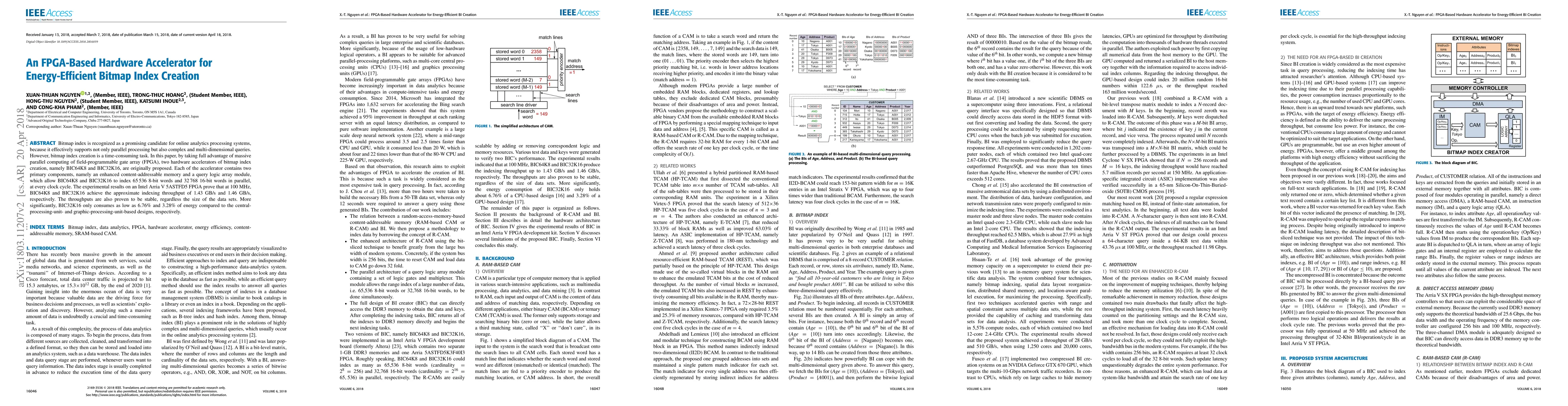 This paper proposes two FPGA-based hardware accelerators, BIC64K8 and BIC32K16, for efficient bitmap index creation, achieving high throughput of 1.43 GB/s and 1.46 GB/s respectively, while significantly reducing energy consumption by 6.76% and 3.28% compared to CPU and GPU designs.