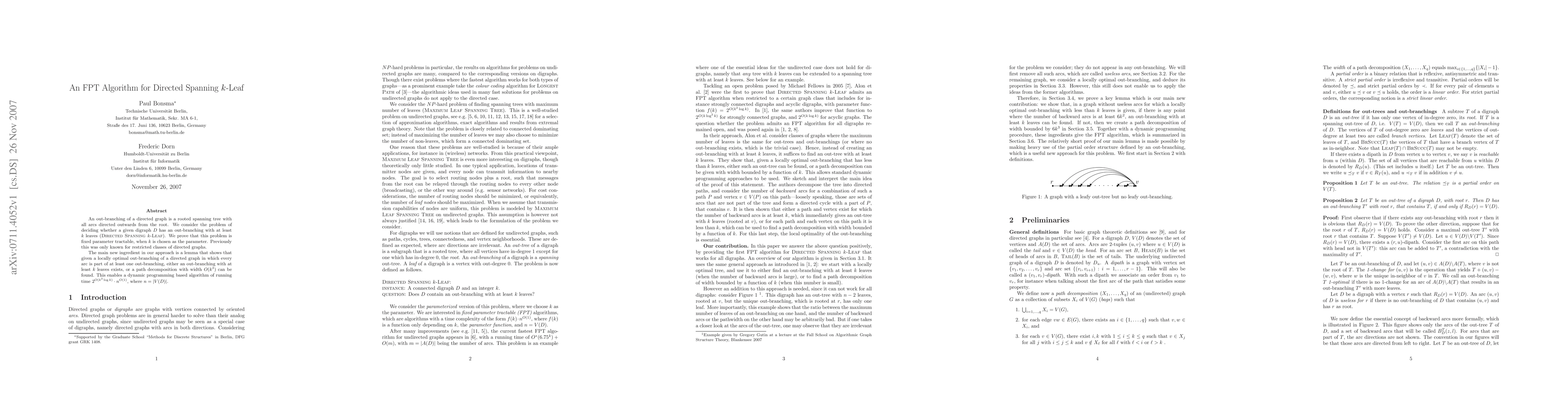 This paper presents an FPT algorithm for the Directed Spanning k-Leaf problem, proving its tractability when k is the parameter. The key contribution is a lemma that either finds an out-branching with at least k leaves or identifies a path decomposition, enabling a dynamic programming algorithm with a runtime of 2^{O(k^3 \log k)} n^{O(1)}.