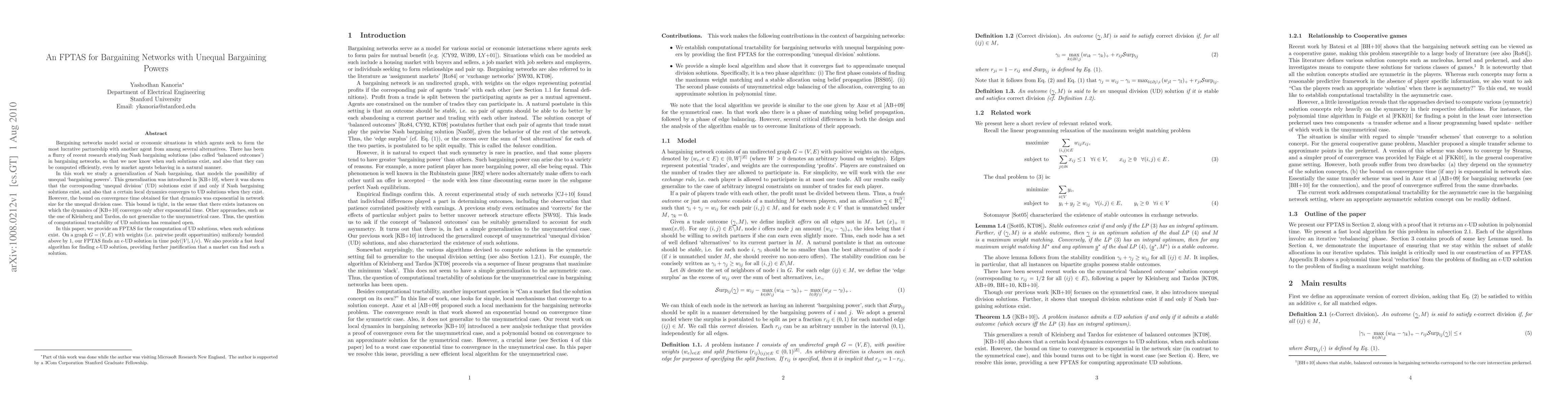 Bargaining networks model social or economic situations in which agents seek to form the most lucrative partnership with another agent from among several alternatives. There has been a flurry of recent research studying Nash bargaining solutions (also called 'balanced outcomes') in bargaining networks, so that we now know when such solutions exist, and also that they can be computed efficiently, even by market agents behaving in a natural manner. In this work we study a generalization of Nash bargaining, that models the possibility of unequal 'bargaining powers'. This generalization was introduced in [KB+10], where it was shown that the corresponding 'unequal division' (UD) solutions exist if and only if Nash bargaining solutions exist, and also that a certain local dynamics converges to UD solutions when they exist. However, the bound on convergence time obtained for that dynamics was exponential in network size for the unequal division case. This bound is tight, in the sense that there exists instances on which the dynamics of [KB+10] converges only after exponential time. Other approaches, such as the one of Kleinberg and Tardos, do not generalize to the unsymmetrical case. Thus, the question of computational tractability of UD solutions has remained open. In this paper, we provide an FPTAS for the computation of UD solutions, when such solutions exist. On a graph G=(V,E) with weights (i.e. pairwise profit opportunities) uniformly bounded above by 1, our FPTAS finds an \eps-UD solution in time poly(|V|,1/\eps). We also provide a fast local algorithm for finding \eps-UD solution, providing further justification that a market can find such a solution.