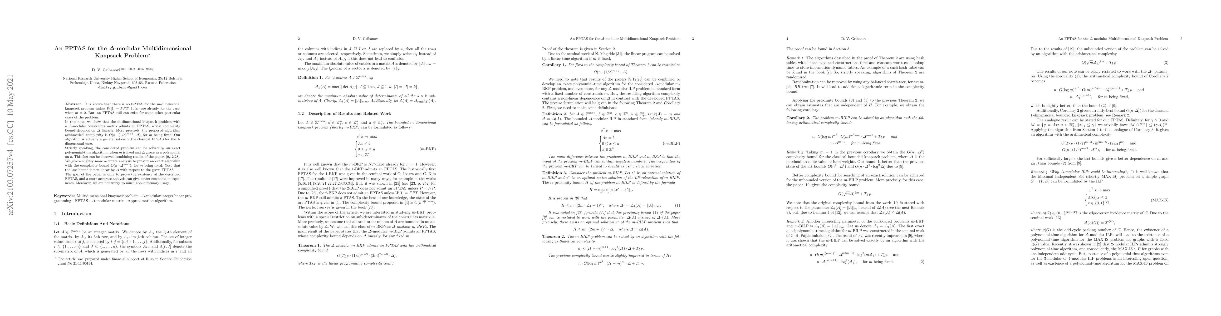 This paper presents an FPTAS for the $m$-dimensional knapsack problem with $\Delta$-modular constraints, showing its complexity depends linearly on $\Delta$. The algorithm generalizes the classical FPTAS for the 1-dimensional case and provides an exact polynomial-time solution for fixed $m$ with complexity $O(n \cdot \Delta^{m + 1})$.